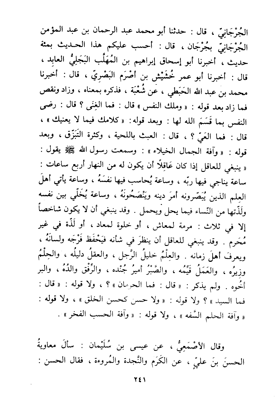 الجرجاني، قال: حَدَّثَنَا أَبُو مُحَمَّد عبد الرحمن بن عبد المؤمن الجرجاني بجرجان، قال: أحسب عليكم هذا الحديث بمئة حديث، أخبرنا أَبُو إسحاق إِبْرَاهِيم بْن المهلب البجلي العابد، قال: أخبرنا أَبُو عُمَر خشيش بْن أصرم البَصْرِيّ، قال: أَخْبَرَنَا مُحَمَّد بْن عَبد اللَّه الحبطي، عن شعبة، فذكره بمعناه، وزاد ونقص فما زاد بعد قوله: وملك النفس"قال: فما الغنى؟ قال: رضى النفس بما قسم اللَّه لها: وبعد قوله: كلامك فيما لا يعنيك"، قال: فما العي؟ ، قال: العبث باللحية، وكثرة التبزق، وبعد قوله: وآفة الجمال الخيلاء": وسمعت رَسُول اللَّهِ صلى الله عليه وسلم يقول: ينبغي للعاقل إذا كَانَ عاقلا أن يكون له من النهار أربع ساعات: ساعة يناجي فيها ربه، وساعة يحاسب فيها نفسه، وساعة يأتي أهل العلم الذين يبصرونه أمر دينه وينصحونه، وساعة يخلي بين نفسه ولذتها من النساء فيما يحل ويحمل. وقد ينبغي أن لا يكون شاخصا إلا في ثلاث: مرمة لمعاش، أو خلوة لمعاد، أو لذة في غير محرم. وقد ينبغي للعاقل أن ينظر في شأنه فيحفظ فرجه ولسانه، ويعرف أهل زمانه. والعلم خليل الرجل، والعقل دليله، والحلم وزيره، والعمل قيمه، والصبر أمير جنده، والرفق والده، والبر أخوه. ولم يذكر: قال: فما الحرمان"؟ ، ولا قوله: قال: فما السيد"؟ ولا قوله: ولا حسن كحسن الخلق"، ولا قوله: وآفة الحلم السفه"، ولا قوله: وآفة الحسب الفخر.