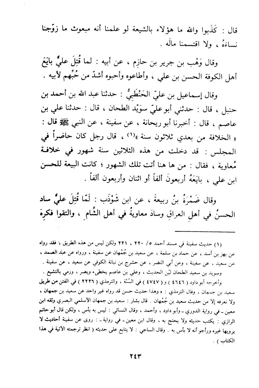 وَقَال إِسْمَاعِيل بْن عَلِيّ الحنطبي: حَدَّثَنَا عَبد اللَّهِ بْن أَحْمَد بْن حنبل، قال: حدثني أَبُو عَلِيّ سويد الطحان، قال: حَدَّثَنَا عَلِيّ بْن عاصم، قال: أخبرنا أَبُو ريحانة، عن سفينة، عن النَّبِيّ صلى الله عليه وسلم قال: الخلافة من بعدي ثلاثون سنة" (1) ، قال رجل كَانَ حاضرا في المجلس: قد دخلت من هذه الثلاثين سنة شهور في خلافة معاوية، فقال: من ها هنا أتت تلك الشهور، كانت البيعة للحسن ابن عَلِيّ، بايعه أربعون ألفا أو أثنان وأربعون ألفا.