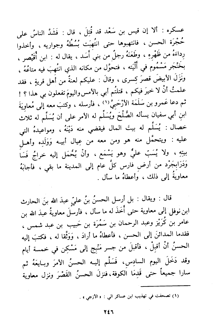 عسكره: ألا إن قيس بْن سعد قد قتل، قال: فشد الناس على حجرة الْحَسَن، فانتهبوها حتى انتهبت بسطه وجواريه، وأخذوا رداءة من ظهره، وطعنه رجل من بني أسد، يقال له: ابْن أقيصر، بخنجر مسموم في أليته، فتحول من مكانه الذي انتهب فيه متاعه، ونزل الأبيض قصر كسرى، وَقَال: عليكم لعنة من أهل قرية، فقد علمت أن لا خير فيكم، قتلتم أبي بالأمس واليوم تفعلون بي هذا؟ ! ثم دعا عَمْرو بْن سلمة الأرحبي (1) ، فأرسله، وكتب معه إلى معاوية ابن أَبي سفيان يسأله الصلح ويسلم له الأمر على أن يسلم له ثلاث خصال: يسلم له بيت المال فيقضي منه دينه، ومواعيده التي عليه: ويتحمل منه هو ومن معه من عيال أبيه وولده وأهل بيته، ولا يسب عَلِيّ وهو يسمع، وأن يحمل إليه خراج فسا ودرابجرد من أرض فارس كل عام إلى المدينة ما بقي، فأجابه معاوية إلى ذلك، وأعطاه ما سأل.