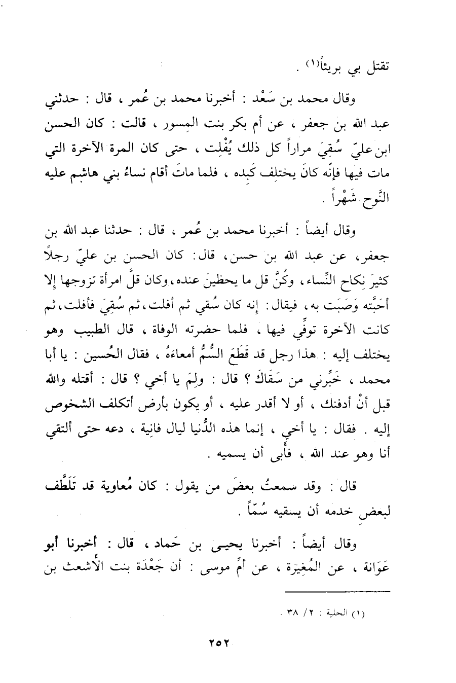 وَقَال أيضا: أخبرنا مُحَمَّد بْن عُمَر، قال: حَدَّثَنَا عَبد اللَّهِ بْن جعفر، عن عَبد اللَّه بْن حسن، قال: كَانَ الْحَسَن بْن عَلِيّ رجلا كثير نكاح النساء، وكن قل ما يحظين عنده، وكان قل امرأة تزوجها إلا أحبته وصبت بِهِ، فيقال: إنه كَانَ سقي ثم أفلت، ثم سقي فأفلت، ثم كانت الآخرة توفي فيها، فلما حضرته الوفاة، قال الطبيب وهو يختلف إليه: هذا رجل قد قطع السم أمعاءه، فقال الحسين: يا أبا مُحَمَّد، خبرني من سقاك؟ قال: ولم يا أخي؟ قال: أقتله والله قبل أن أدفنك، أو لا أقدر عليه، أو يكمن بأرض أتكلف الشخوص إليه. فقال: يا أخي، إنما هذه الدنيا ليال فانية، دعه حتى ألتقي أنا وهو عند اللَّه، فأبى أن يسميه.