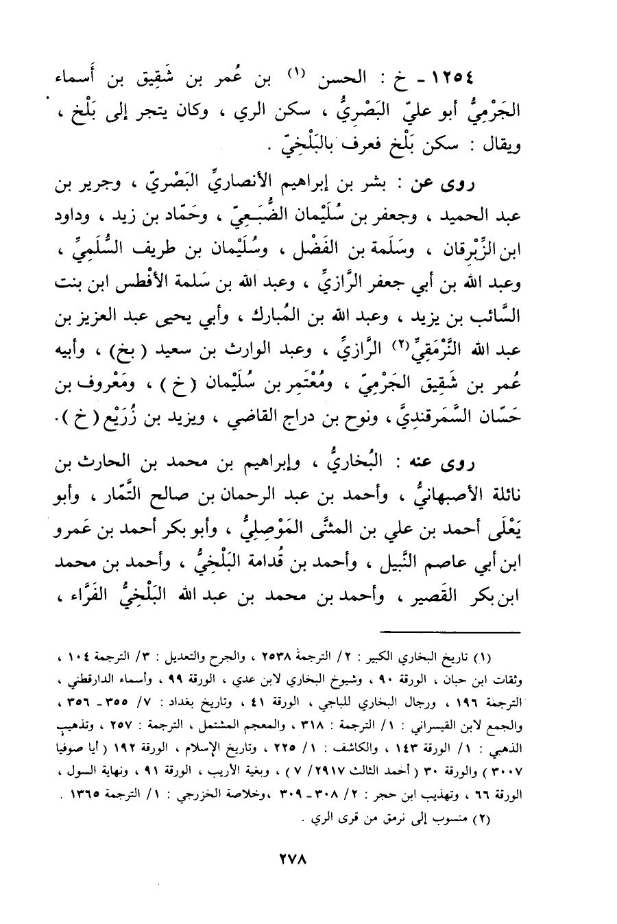 1254 - خ: الْحَسَن بن عُمَر بن شقيق بن أسماء الجرمي أَبُو عَلِيّ البَصْرِيّ (1) ، سكن الري، وكان يتجر إلى بلخ، ويُقال: سكن بلخ فعرف بالبلخي.