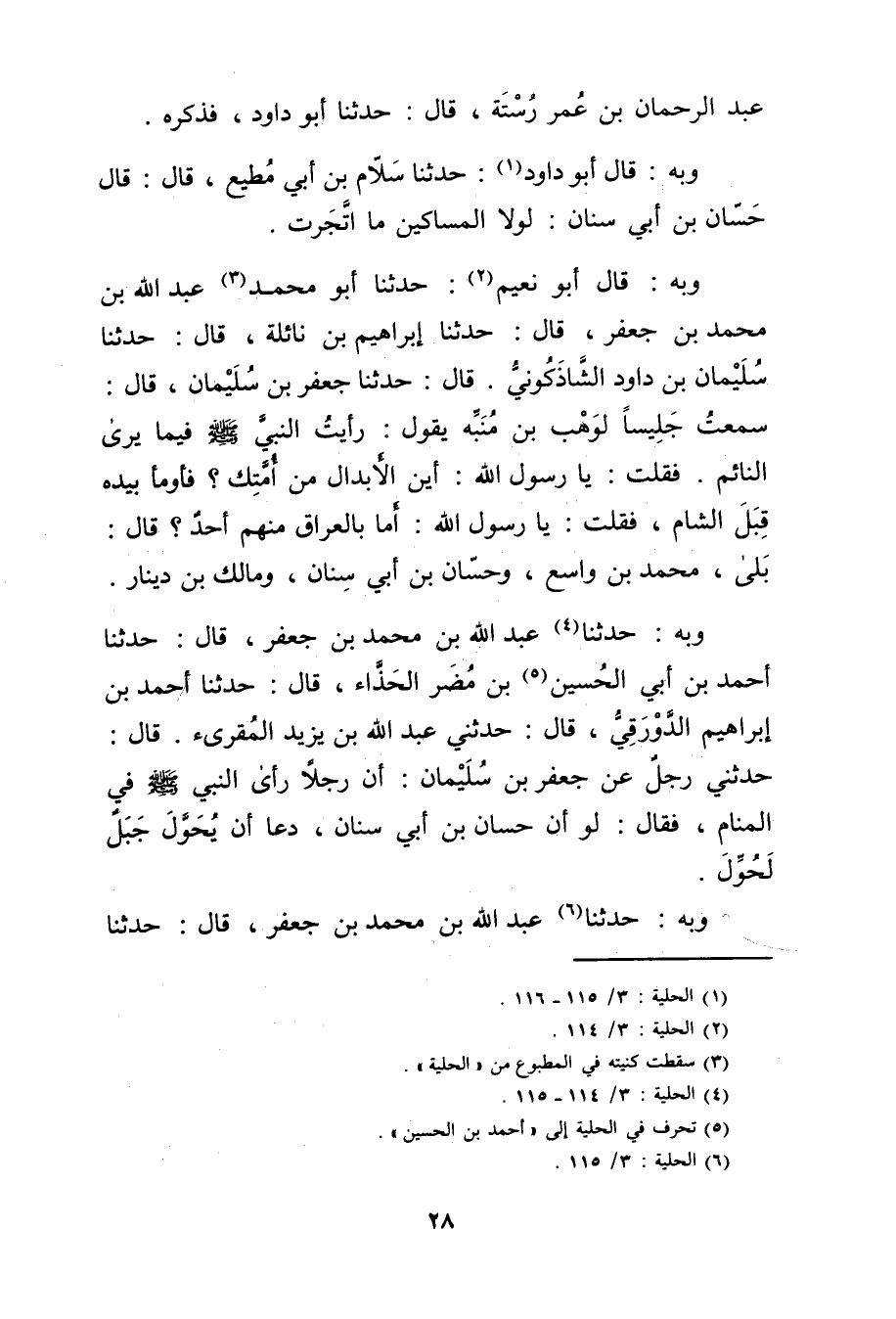 وبه: قال أَبُو نعيم (2) : حَدَّثَنَا أَبُو مُحَمَّد (3) عَبد اللَّهِ بْن مُحَمَّد بْنِ جَعْفَرٍ، قال: حَدَّثَنَا إِبْرَاهِيمُ بْنُ نَائِلَةَ، قال: حَدَّثَنَا سُلَيْمان بْنُ دَاوُدَ الشَّاذَكُونِيُّ. قال: حَدَّثَنَا جَعْفَرُ بْنُ سُلَيْمان، قال: سَمِعْتُ جَلِيسًا لِوَهْبِ بْنِ مُنَبِّهٍ يَقُولُ: رَأَيْتُ النَّبِيَّ صَلَّى اللَّهُ عَلَيْهِ وسلم فِيمَا يَرَى النَّائِمُ. فَقُلْتُ: يارسول اللَّهِ: أَيْنَ الأَبْدَالُ مِنْ أُمَّتِكَ؟ فَأَوْمَأَ بِيَدِهِ قِبَلَ الشَّامِ، فَقُلْتُ: يَا رَسُولَ اللَّهِ: أَمَا بِالْعِرَاقِ مَنْهُمْ أَحَدٌ؟ قال: بَلَى، مُحَمَّدُ بْنُ واسِعٍ، وحَسَّانُ بْنُ أَبي سِنَانٍ، ومَالِكُ بْنُ دِينَارٍ.