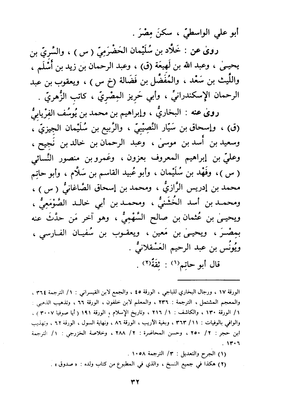 = الورقة 17، رجال البخاري للباجي، الورقة 45، والجمع لابن القيسراني: 1 / الترجمة 364، والمعجم المشتمل، الترجمة: 236، والمعلم لابن خلفون، الورقة 66، وتذهيب الذهبي: 1 / الورقة 130، والكاشف: 1 / 216، وتاريخ الاسلام، الورقة 191 (أيا صوفيها 3007) ، والوافي بالوفيات: 11 / 363، وبغية الاريب، الورقة 86، ونهاية السول، الورقة 62، وتهذيب ابن حجر: 2 / 250، وحسن المحاضرة: 2 / 288، وخلاصة الخزرجي: 1 / الترجمة 1306.