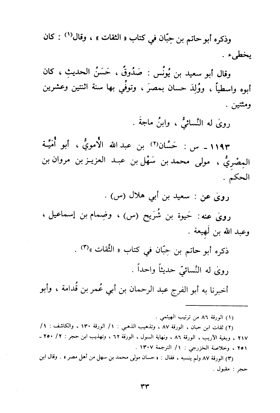 (3) الورقة 87 ولم ينسبه، فقال: حَسَّانٌ مَوْلَى مُحَمَّدِ بْنِ سَهْلٍ من أهل مصر". وَقَال ابن حجر: مقبول.