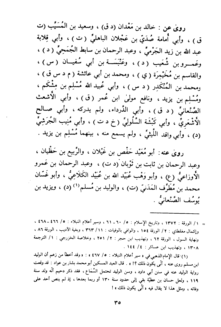 (1) قال الإمام الذهبي في "سير أعلام النبلاء: 5 / 467": وقد أخطأ من زعم أن الوليد ابن مسلم روى عنه، أنى يكون ذلك؟ ! ". قال العبد المسكين أبو محمد بشار بن عواد: قد وقعت رواية الوليد عنه في سنن أبى داود، وسن الوليد تحتمل السماع، فقد ذكر دحيم أنه ولد سنة 119، ولعل حسان بن عطية بقي إلى حدود سنة 130 أو ربما بعدها، إذ لم ينص أحد على وفاته، ومثل هذا لا يقال فيه"أنى يكون ذلك"!