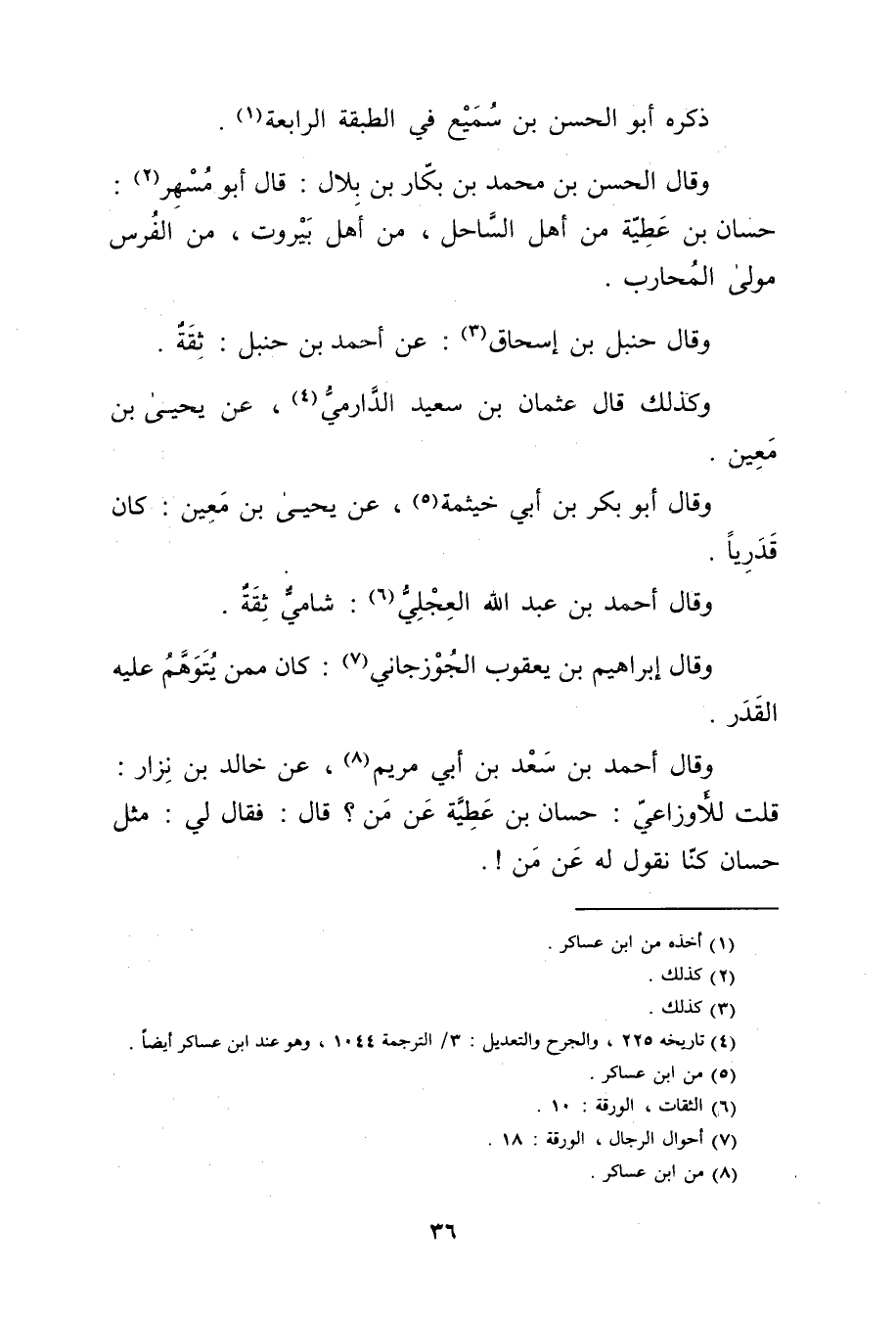 (4) تاريخه 225، والجرح والتعديل: 3 / الترجمة 1044، وهو عند ابن عساكر أيضا.