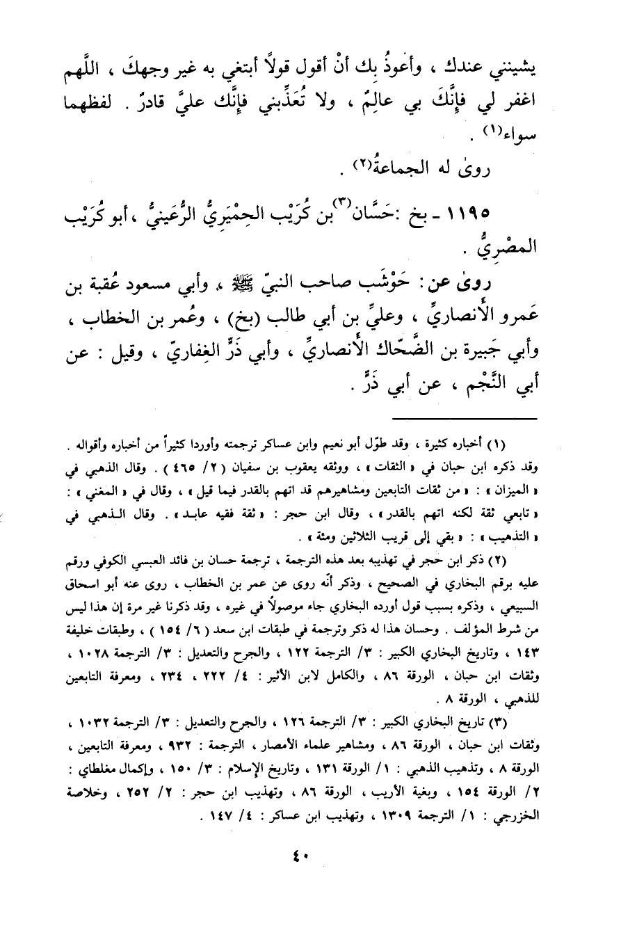 (2) ذكر ابن حجر في تهذيبه بعد هذه الترجمة، ترجمة حسان بن فائد العبسي الكوفي ورقم عليه برقم البخاري في الصحيح، وذكر أنه روى عن عُمَر بن الخطاب، روى عنه أبو إسحاق السبيعي، وذكره بسبب قول أورده البخاري جاء موصولا في غيره، وقد ذكرنا غير مرة إن هذا ليس من شرط المؤلف. وحسان هذا له ذكر وترجمة في طبقات ابن سعد (6 / 154) ، وطبقات خليفة 143، وتاريخ البخاري الكبير: 3 / الترجمة 122، والجرح والتعديل: 3 / الترجمة 1028، وثقات ابن حبان، الورقة 86، والكامل لابن الاثير: 4 / 222، 234، ومعرفة التابعين للذهبي، الورقة 8.