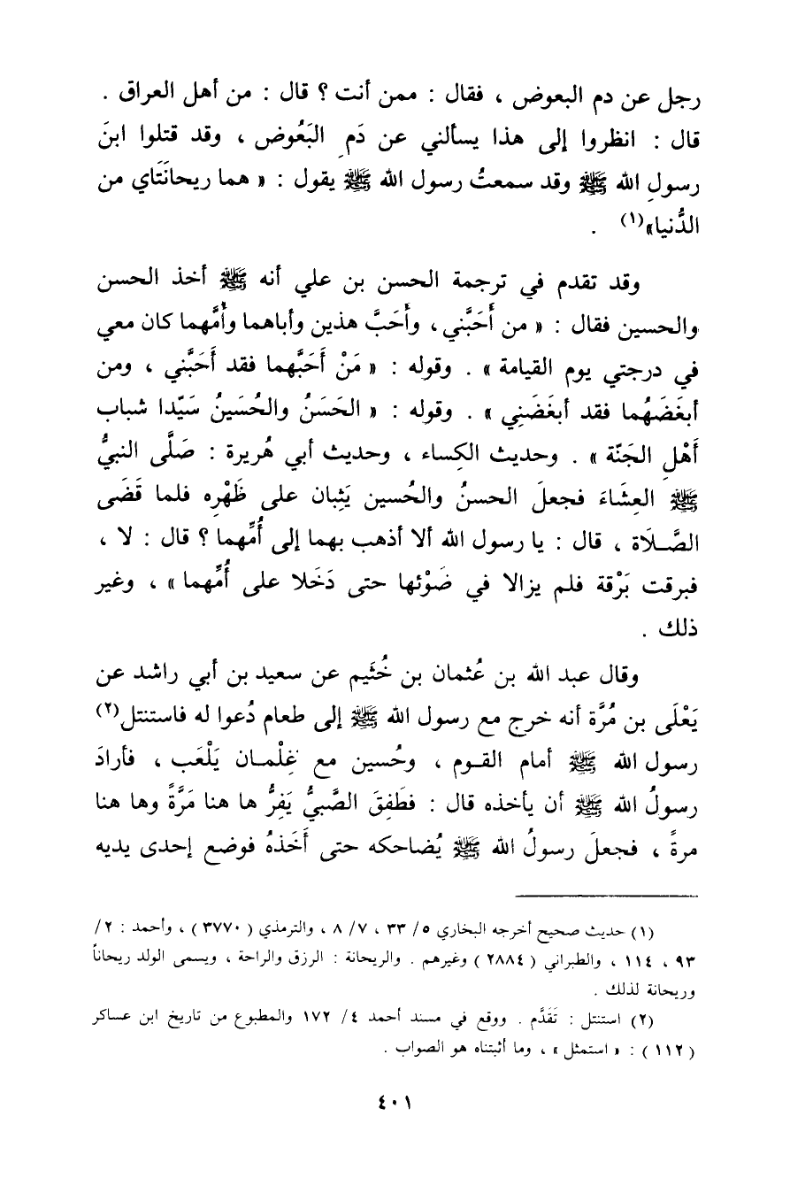 رَجُلٌ عن دَمِ الْبَعُوضِ، فَقَالَ: مَمَّنْ أَنْتَ؟ قال: مِنْ أَهْلِ الْعِرَاقِ. قال: انْظُرُوا إِلَى هَذَا يَسْأَلُنِي عن دَمِ الْبَعُوضِ، وقَدْ قَتَلُوا ابْنَ رَسُولِ اللَّهِ صلى الله عليه وسلم وقَدْ سَمِعْتُ رَسُول اللَّهِ صلى الله عليه وسلم يَقُولُ: هُمَا رَيْحَانَتَاي مِنَ الدُّنْيَا" (1) .