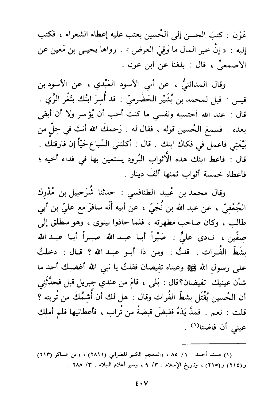 عون: كتب الْحَسَن إلى الحسين يعتب عليه إعطاء الشعراء، فكتب إليه: إن خير المال ما وقي العرض". رواها يحيى بْن مَعِين عن الأَصْمَعِيّ، قال: بلغنا عن ابْن عون.