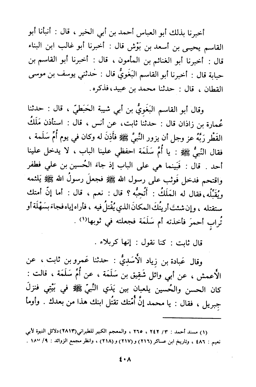 أَخْبَرَنَا بِذَلِكَ أَبُو الْعَبَّاسِ أَحْمَدُ بْن أَبي الخير، قال: أَنْبَأَنَا أَبُو الْقَاسِمِ يَحْيَى بْن أسعد بْنِ بَوْشٍ قال: أخبرنا أَبُو غالب ابْن البناء قال: أخبرنا أَبُو الغنائم بْن المأمون، قال: أخبرنا أَبُو القاسم بْن حبابة قال: أخبرنا أَبُو القاسم البغوي قال: حدثني يوسف بْن موسى القطان، قال: حَدَّثَنَا مُحَمَّد بْن عُبَيد، فذكره وَقَال أَبُو الْقَاسِمِ البغوي بن أَبي شَيْبَة الْحَبَطِيُّ، قال: حَدَّثَنَا عُمَارَةُ بْنُ زَاذَانَ قال: حَدَّثَنَا ثَابِتُ، عن أَنَسٍ، قال: اسْتَأْذَنَ ملك القطر ربه عزوجل أَنْ يَزُورَ النَّبِيَّ صلى الله عليه وسلم فَأَذِنَ لَهُ وكَانَ فِي يَوْمِ أُمِّ سَلَمَةَ، فَقَالَ النَّبِيُّ صلى الله عليه وسلم: يَا أُمَّ سَلَمَةَ احْفَظِي عَلَيْنَا الْبَابَ، لا يَدْخُلُ عَلَيْنَا أَحَدٌ. قال: فَبَيْنَمَا هِي عَلَى الْبَابِ إِذْ جَاءَ الْحُسَيْنُ بْنُ عَلِيٍّ فَطَفَرَ واقْتَحَمَ فَدَخَلَ فَوَثَبَ عَلَى رَسُول اللَّهِ صلى الله عليه وسلم فَجَعَلَ رَسُولُ اللَّهِ صلى الله عليه وسلم يَلْثَمُهُ ويُقَبِّلَهُ، فَقَالَ لَهُ الْمَلَكُ: أَتُحِبَّهُ؟ قال: نَعَمْ، قال: أَمَا إِنَّ أُمَّتَكَ سَتَقْتُلُهُ، وإِنْ شِئْتَ أَرَيْتُكَ الْمَكَانَ الَّذِي يُقْتَلُ فِيهِ، فَأَرَاهُ إِيَّاهُ فَجَاءَ بِسَهْلَةٍ أَوْ تُرَابٍ أَحْمَرَ فَأَخَذَتْهُ أُمُّ سَلَمَةَ فَجَعَلْتُهُ فِي ثَوْبِهَا (1) .