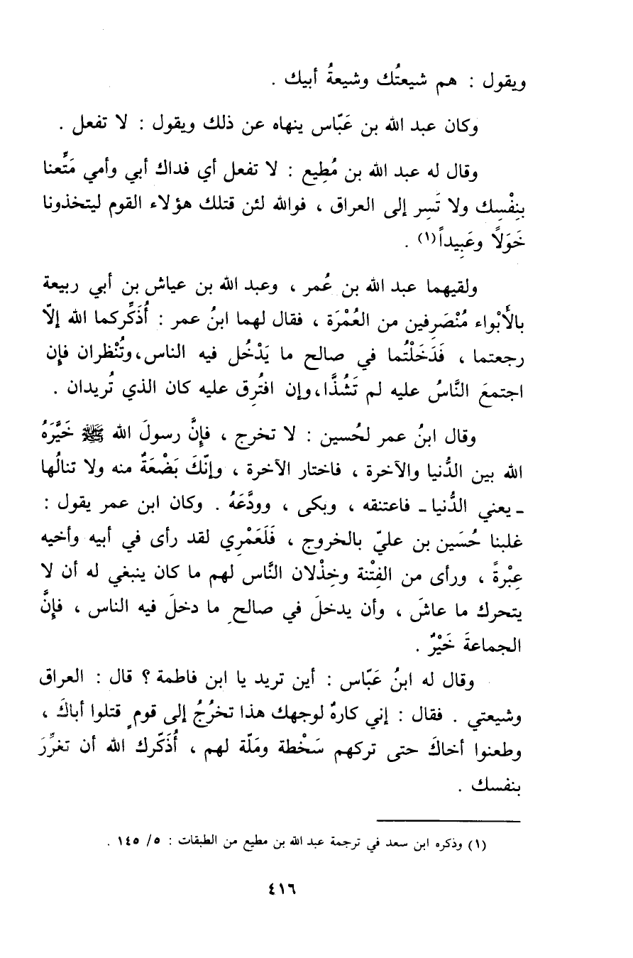 وَقَال له عَبد اللَّه بْن مطيع: لا تفعل أي فداك أبي وأمي متعنا بنفسك ولا تسر إلى العراق، فوالله لئن قتلك هؤلاء القوم ليتخذونا خولا وعُبَيدا (1) .