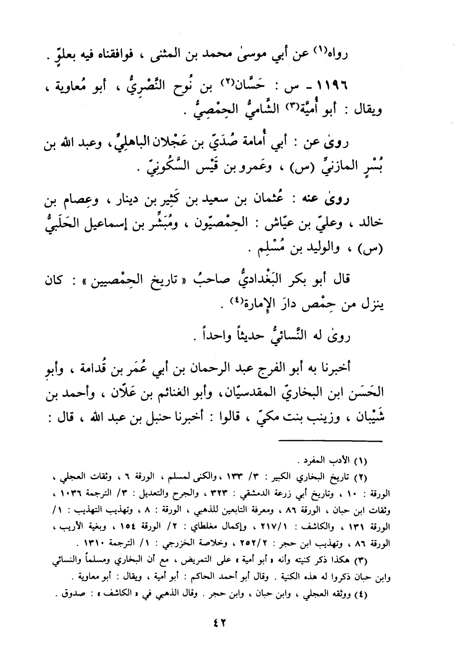 1196 - س: حسان بن نوح النصري (2) ، أَبُو معاوية، ويُقال: أَبُو أمية (3) الشامي الحمصي.
