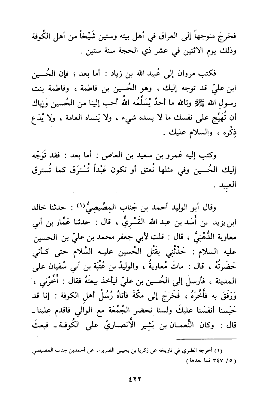 وَقَال أَبُو الوليد أَحْمَد بْن جناب المصيصي (1) : حَدَّثَنَا خالد ابن يزيد بْن أسد بْن عَبد اللَّه القسري، قال: حَدَّثَنَا عمار بْن أَبي معاوية الدهني، قال: قلتُ لأبي جعفر مُحَمَّد بْن عَلِيّ بْن الحسين عليه السلام: حدثني بقتل الحسين عليه السلام حتى كأني حضرته، قال: مات معاوية، والوليد بْن عتبة بْن أَبي سفيان على المدينة، فأرسل إلى الحسين بْن عَلِيّ ليأخذ بيعته فقال: أخرني، ورفق بِهِ فأخره، فخرج إلى مكة فأتاه رسل أهل الكوفة: إنا قد حبسنا أنفسنا عليك ولسنا نحضر الجمعة مع الوالي فاقدم علينا، قال: وكان النعمان بْن بشير الأَنْصارِيّ على الكوفة - فبعث
