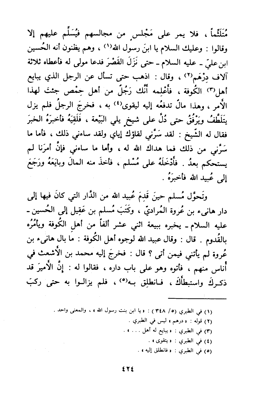 متلثما، فلا يمر على مجلس من مجالسهم فيسلم عليهم إلا وَقَالوا: وعليك السلام يا ابْن رسول اللَّه (1) ، وهم يظنون أنه الحسين ابن عَلِيّ - عليه السلام - حتى نزل القصر فدعا مولى له فأعطاه ثلاثة آلاف درهم (2) ، وَقَال: اذهب حتى تسأل عن الرجل الذي يبايع أهل (3) الكوفة، فأعلمه أنك رجل من أهل حمص جئت لهذا الامر، وهذا المال تدفعه إليه ليقوى (4) بِهِ، فخرج الرجل فلم يزل يتلطف ويرفق حتى دل على شيخ يلي البيعة، فلقيه فأخبره الخبر فقال له الشيخ: لقد سرني لقاؤك إياي ولقد ساءني ذلك، فأما ما سرني من ذلك فما هداك اللَّه له، وأما ما ساءني فإن أمرنا لم يستحكم بعد. فأدخله على مسلم، فأخذ منه المال وبايعه ورجع إلى عُبَيد اللَّه فأخبره.