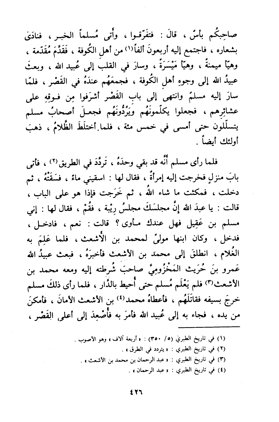 فلما رأى مسلم أنه قد بقي وحده، تردد في الطريق (2) ، فأتى باب منزل فخرجت إليه امرأة، فقال لها: اسقيني ماء، فسقته، ثم دخلت، فمكثت ما شاء اللَّه، ثم خرجت فإذا هو على الباب، قالت: يا عَبد اللَّه إن مجلسك مجلس ريبة، فقم، فقال لها: إني مسلم بْن عقيل فهل عندك مأوى؟ قالت: نعم، فادخل، فدخل، وكان ابنها مولى لمحمد بْن الأشعث، فلما علم بِهِ الغلام، انطلق إلى مُحَمَّد بْن الأشعث فأخبره، فبعث عُبَيد اللَّه عَمْرو بْن حريث المخزومي صاحب شرطته إليه ومعه مُحَمَّد بْن الأشعث (3) فلم يعلم مسلم حتى أحيط بالدار، فلما رأى ذلك مسلم خرج بسيفه فقاتلهم، فأعطاه مُحَمَّد (4) بْن الأشعث الأمان، فأمكن من يده، فجاء بِهِ إلى عُبَيد اللَّه فأمر بِهِ فأصعد إلى أعلى القصر،