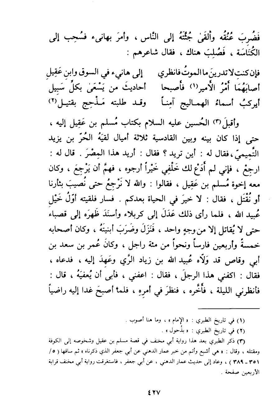 (3) ذكر الطبري بعد هذا رواية أبي مخنف في قصة مسلم بن عقيل وشخوصة إلى الكوفة ومقتله، وَقَال: هي أشبع وأتم من خبر عمار الدهني عَن أبي جعفر الذي ذكرناه"ثم ساقها (5 / 351 - 389) ، وعاد إلى حديث عمار الدهني، عَن أبي جعفر، فاستغرقت رواية أبي مخنف قرابة الاربعين صفحة.