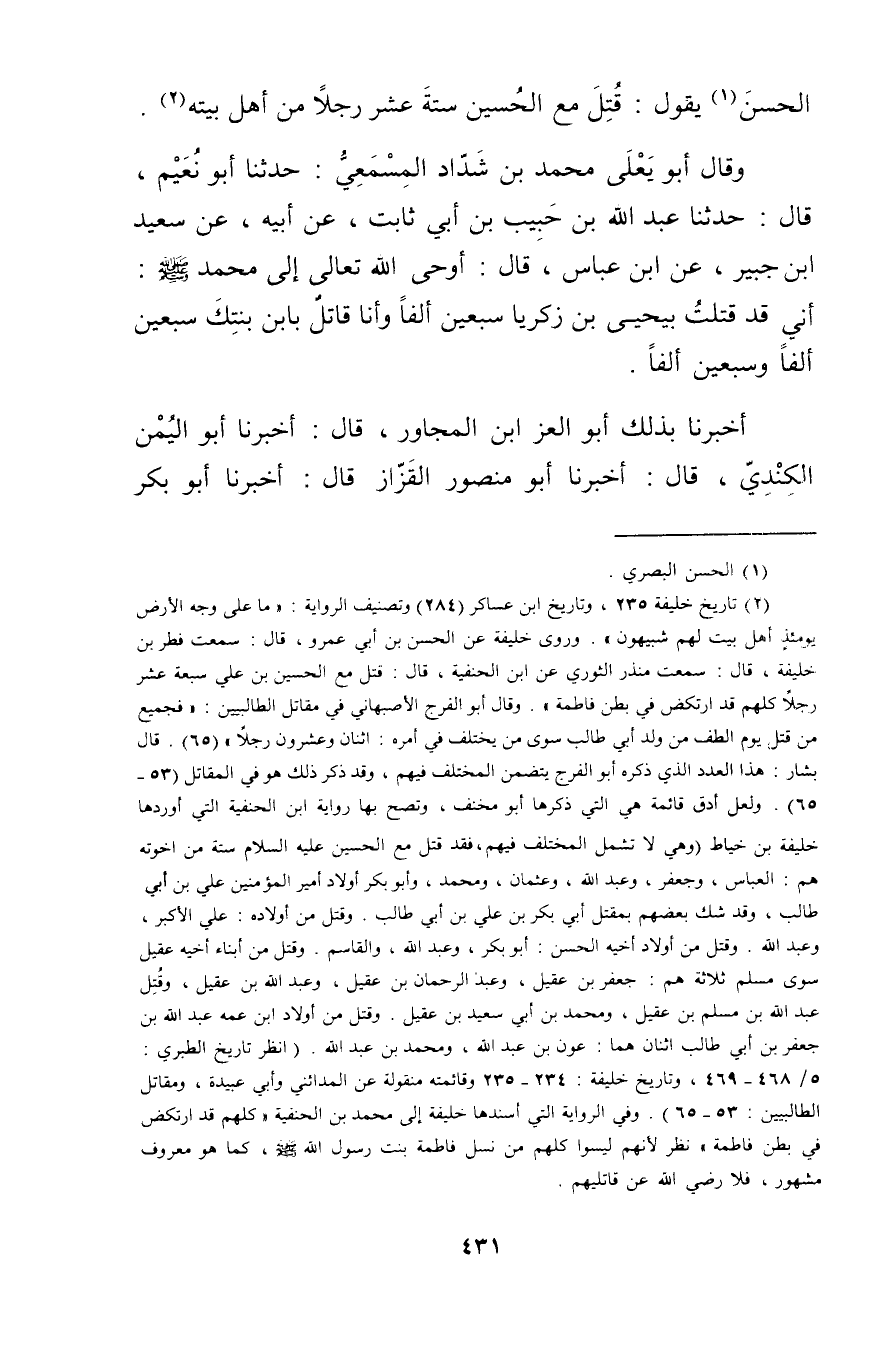(2) تاريخ خليفة 235، وتايخ ابن عساكر (284) وتصنيف الرواية: ما على وجه الارض يومئذ أهل بيت لهم شبيهون". وروى خليفة عن الحسن بن أَبي عَمْرو، قال: سمعت فطر بن خليفة، قال: سمعت منذر الثوري عن ابن الحنفية، قال: قتل مع الحسين بن علي سبعة عشر رجلا كلهم قد ارتكض في بطن فاطمة". وَقَال أبو الفرج الأصبهاني في مقاتل الطالبيين: فجميع من قتل يوم الطف من ولد أبي طالب سوى من يختلف في أمره: اثنان وعشرون رجلا" (65) . قال بشار: هذا العدد الذي ذكره أبو الفرج يتضمن المختلف فيهم، وقد ذكر ذلك هو في المقاتل (53 - 65) . ولعل أدق قائمة هي التي ذكرها أبو مخنف، وتصح بها رواية ابن الحنفية التي أوردها خليفة بن خياط (وهي لا تشمل المختلف فيهم، فقد قتل مع الحسين عليه السلام ستة من أَخُوته هم: العباس، وجعفر، وعبد الله، وعثمان، ومحمد، وأبو بكر أولاد أمير المؤمنين علي بن أَبي طالب، وقد شك بعضهم بمقتل أبي بكر بن علي بن أَبي طالب وقتل من أولاده: علي الاكبر، وعبد الله. وقتل من أولاد أخيه الحسن: أبو بكر، وعبد الله، والقاسم. وقتل من أبناء أخيه عقيل سوى مسلم ثلاثة هم: جعفر بن عقيل، وعبد الرحمن بن عقيل، وعبد الله بن عقيل، وقتل عَبد الله بن مسلم بن عقيل، ومحمد بن أَبي سَعِيد بن عقيل. وقتل من أولاد ابن عمه عَبد الله بن جعفر بن أَبي طالب اثنان هما: عون بن عَبد الله، ومحمد بن عَبد الله. (انظر تاريخ الطبري: 5 / 468 - 469، وتاريخ خليفة: 234 - 235 وقائمته منقولة عن المدائني وأبي عُبَيدة، ومقاتل الطالبيين: 53 - 65) . وفي الرواية التي أسندها خليفة إلى محمد بن الحنفية"كلهم قد ارتكض في بطن فاطمة"نظر لانهم ليسوا كلهم من نسل فاطمة بنت رسول الله صلى الله عليه وسلم، كما هو معروف مشهور، فلا رضي الله عن قاتليهم.
