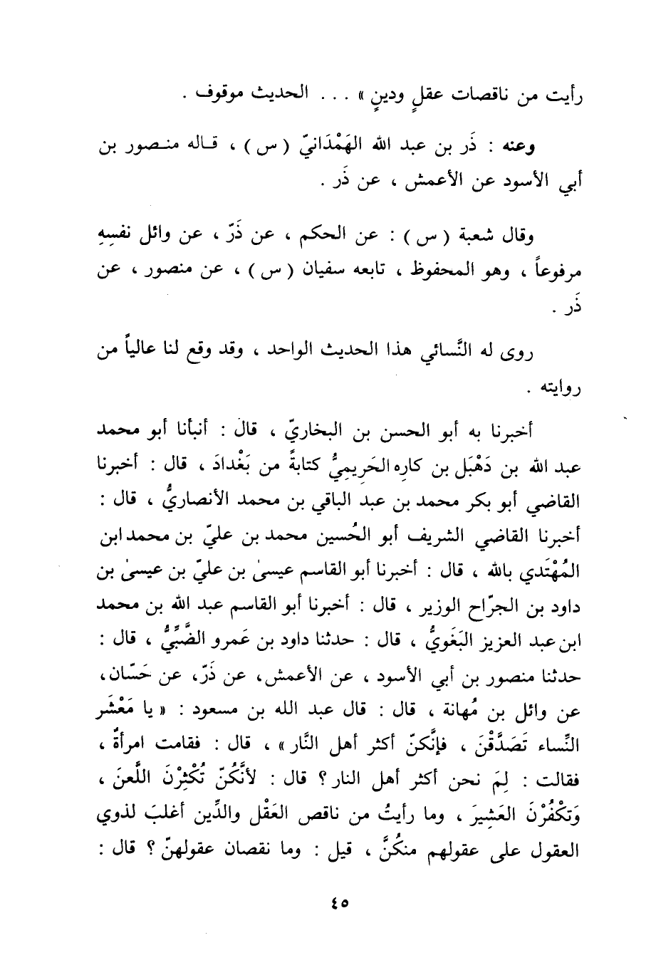 أخبرنا به أَبُو الْحَسَنِ بْنِ الْبُخَارِيِّ، قال: أنبأنا أَبُو مُحَمَّدٍ عَبد اللَّهِ بْنُ دَهْبَلِ بْنِ كَارَةَ الْحَرِيمِيُّ كِتَابَةً مِنْ بَغْدَادَ، قال: أخبرنا الْقَاضِي أَبُو بكر محمد بن عبدا لباقي بْن مُحَمَّد الأَنْصارِيّ، قال: أَخْبَرَنَا الْقَاضِي الشريف أَبُو الْحُسَيْنِ مُحَمَّدُ بن علي بن محمد ابْنُ الْمُهَتِدِي بِاللَّهِ، قال: أَخْبَرَنَا أبو القاسم عيسى بْن علي بْن عيسى بْن داود بْن الجراح الوزير، قال: أَخْبَرَنَا أبو الْقَاسِم عَبد اللَّهِ بْن مُحَمَّد ابن عَبْد العزيز البغوي، قال: حَدَّثَنَا دَاوُدُ بْنُ عَمْرو الضَّبِّيُّ، قال: حَدَّثَنَا مَنْصُورُ بْنُ أَبي الأَسْوَدِ، عن الأَعْمَشِ، عن ذَرٍّ، عن حَسَّانٍ، عن وائِلِ بْنِ مُهَانَةَ، قال: قال عَبد اللَّهِ بْن مَسْعُودٍ: يَا مَعْشَرَ النِّسَاءِ تَصَدَّقْنَ، فإنكن أكثر أهل انار"، قال: فَقَامَتِ امْرَأَةٌ، فَقَالَتْ: لِمَ نَحْنُ أَكْثَرُ أَهْلِ النَّارِ؟ قال: لأَنَّكُنَّ تُكْثِرْنَ اللَّعْنَ، وتَكْفُرْنَ الْعَشِيرِ، ومَا رَأَيْتُ مِنْ نَاقِصِ الْعَقْلِ والدِّينِ أَغْلَبَ لِذَوِي الْعُقُولِ عَلَى عُقُولِهِمْ مِنْكُنَّ، قِيلَ: ومَا نُقْصَانُ عُقُولِهِنَّ؟ قال: