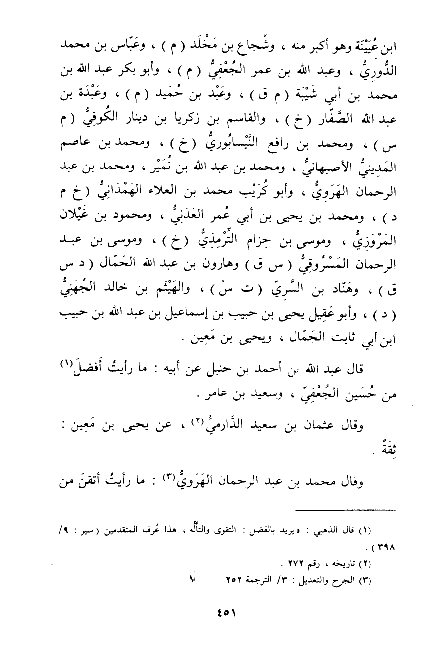 قال عَبد اللَّهِ بْن أحمد بْن حنبل عَن أبيه: ما رأيت أفضل (1) من حسين الجعفي، وسَعِيد بْن عامر.