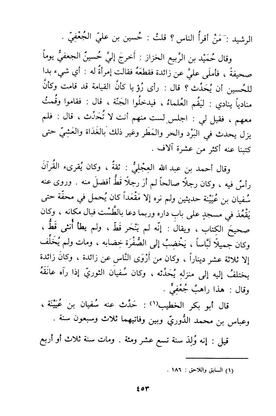الرشيد: من أقرأ الناس؟ قلت: حسين بْن عَلِيّ الجعفي.