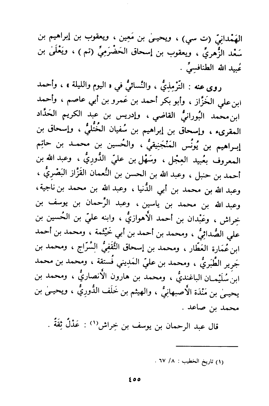 الهمداني (ت سي) ، ويحيى بْن مَعِين، ويعقوب بْن إِبْرَاهِيم بْن سعد الزُّهْرِيّ، ويعقوب بْن إسحاق الحضرمي (تم) ، ويَعْلَى بْن عُبَيد الطنافسي.