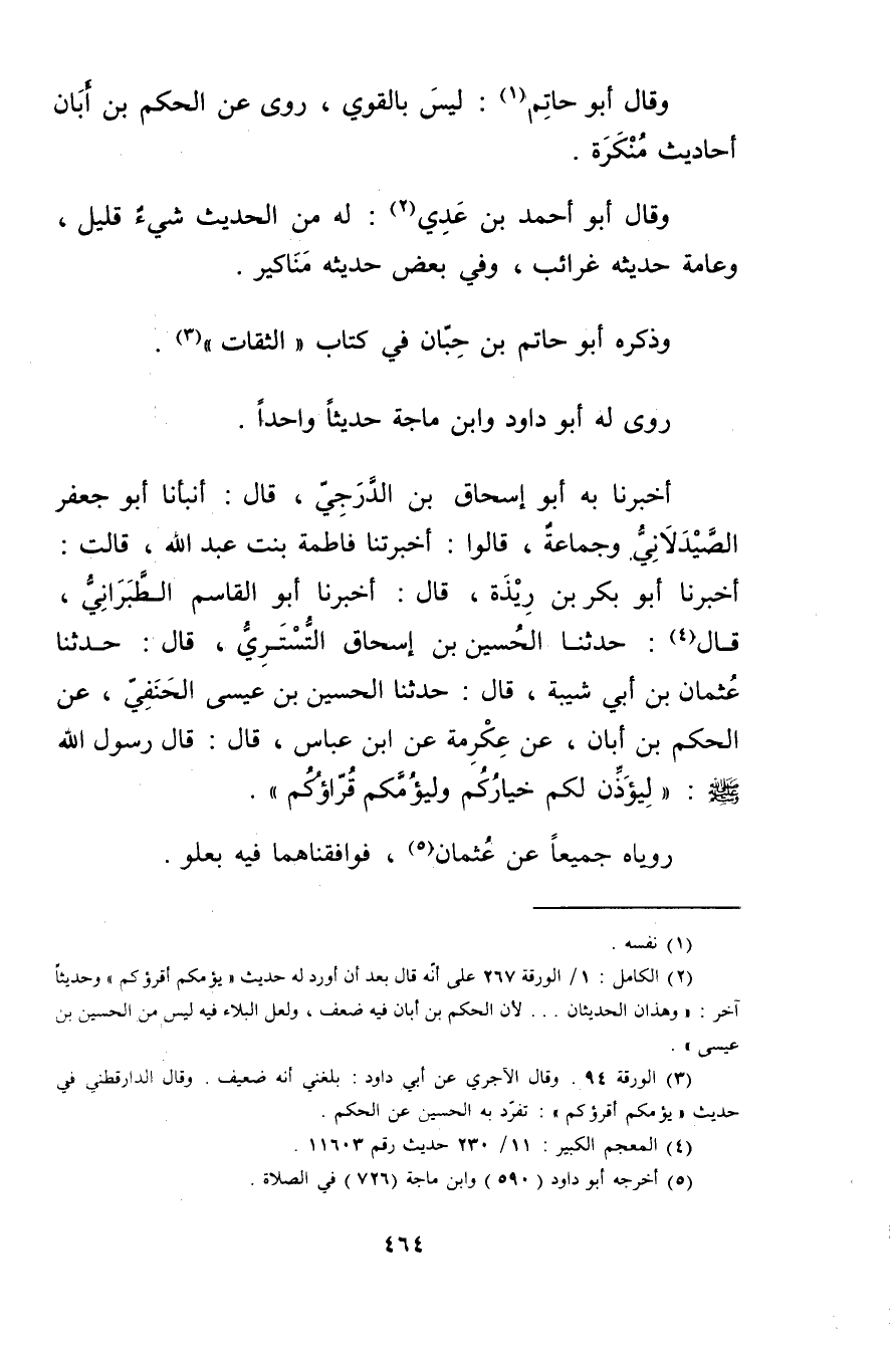 (2) الكامل: 1 / الورقة 267 على أنه قال بعد أن أورد له حديث: "يؤمكم أقرؤكم"وحديثًا آخر: وهذان الحديثًان..لان الحكم بن أبان فيه ضعف، ولعل البلاء فيه ليس من الحسين بن عيسى.