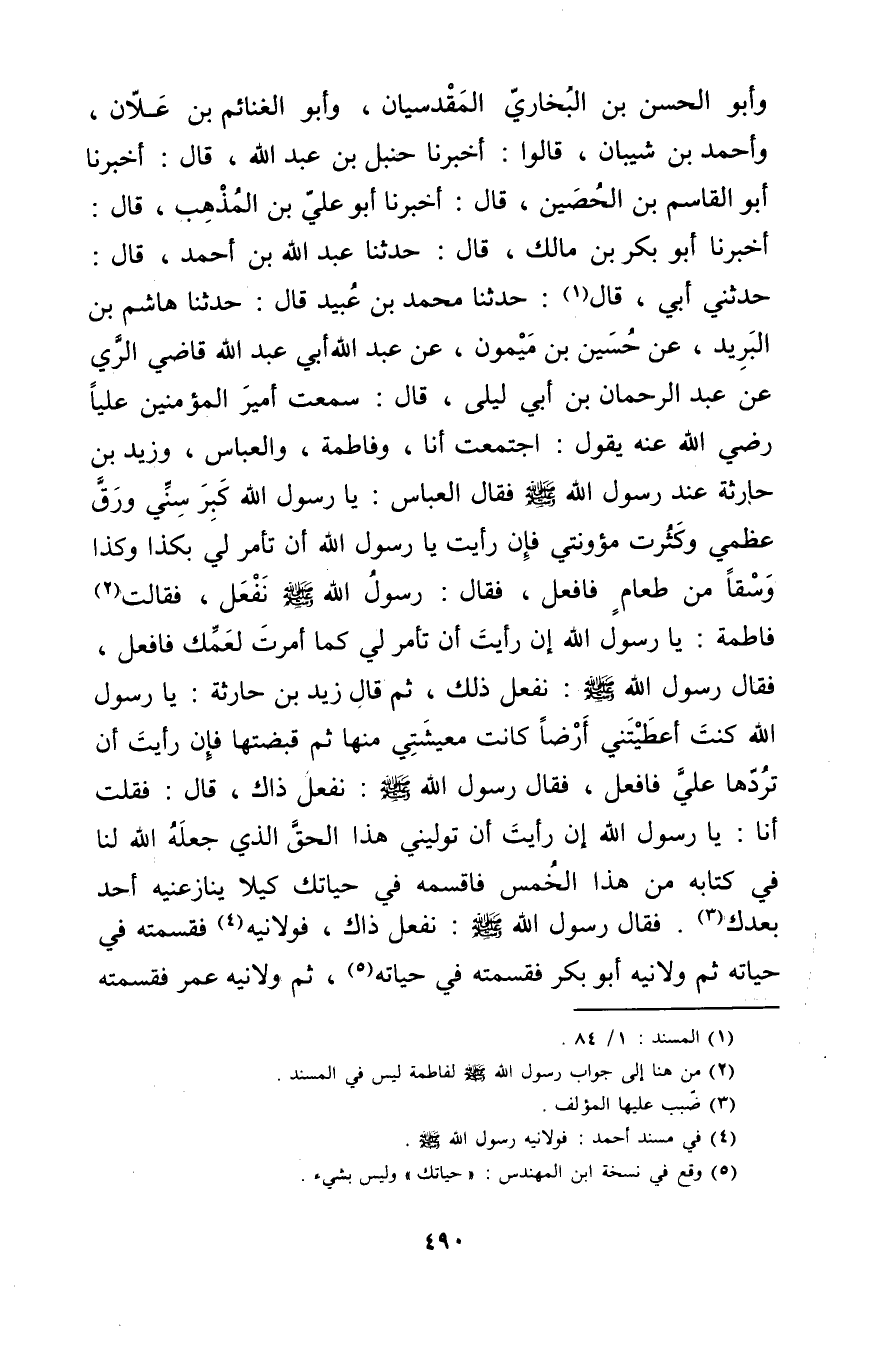 وأَبُو الْحَسَنِ بْنُ الْبُخَارِيِّ الْمَقْدِسِيَّانِ، وأبو الغنائم بْن علان، وأحمد بْنُ شَيْبَانَ، قَالُوا: أَخْبَرَنَا حَنْبَلُ بْن عَبد الله، قال: أَخْبَرَنَا أبو القاسم بْن الحصين، قال: أَخْبَرَنَا أبو علي بْن المذهب، قال: أَخْبَرَنَا أبو بكر بْن مالك، قال: حَدَّثَنَا عَبد الله بْن أَحْمَدَ، قال: حَدَّثني أبي، قال (1) : حَدَّثَنَا مُحَمَّدُ بْنُ عُبَيد قال: حَدَّثَنَا هَاشِمُ بْنُ الْبَرِيدِ، عن حُسَيْنِ بْنِ مَيْمُونٍ، عن عَبد اللَّهِ أَبِي عَبد اللَّهِ قَاضِي الرِّيِّ عن عَبْدِ الرَّحْمَنِ بْنِ أَبي لَيْلَى، قال: سَمِعْتُ أَمِيرَ الْمُؤْمِنِينَ عَلِيًّا رَضِيَ اللَّهُ عَنْهُ يَقُولُ: اجْتَمَعَتُ أَنَا، وفَاطِمَةُ، والْعَبَّاسُ، وزَيْدُ بْنُ حَارِثَةَ عِنْدَ رَسُول اللَّهِ صلى الله عليه وسلم فَقَالَ الْعَبَّاسُ: يَا رَسُولَ اللَّهِ كَبُرَ سِنِّي ورَقَّ عَظْمِي وكثرت مؤونتي فإن رأيت يا رسول االله أَنْ تَأْمُرَ لِي بِكَذَا وكَذَا وسَقًا مِنْ طَعَامٍ فَافْعَلْ، فَقَالَ: رَسُول اللَّهِ صلى الله عليه وسلم نَفْعَلُ، فَقَالَتْ (2) فَاطِمَةُ: يَا رَسُولَ اللَّهِ إِنْ رَأَيْتَ أَنْ تَأْمُرَ لِي كَمَا أَمَرْتَ لِعَمِّكَ فَافْعَلْ، فَقَالَ رَسُولُ اللَّهِ صلى الله عليه وسلم: نَفْعَلُ ذَلِكَ، ثُمَّ قال زَيْدُ بْنُ حَارِثَةَ: يَا رَسُولَ اللَّهِ كُنْتَ أَعْطَيْتَنِي أَرْضًا كَانَتْ مَعِيشَتِي مِنْهَا ثُمَّ قَبَضْتَهَا فَإِنْ رَأَيْتَ أَنْ تَرُدَّهَا عَلَيَّ فَافْعَلْ، فَقَالَ رَسُولُ اللَّهِ صلى الله عليه وسلم: نَفْعَلُ ذَاكَ، قال: فَقُلْتُ أَنَا: يَا رَسُولَ اللَّهِ إِنْ رَأَيْتَ أَنْ تُوَلِّينِي هَذَا الْحَقَّ الَّذِي جَعَلَهُ اللَّهُ لَنَا فِي كِتَابِهِ مِنْ هَذَا الْخُمُسِ فَأَقْسِمْهُ فِي حَيَاتِكَ كَيْلا يُنَازِعْنِيهِ أَحَدٌ بَعْدَكَ (3) . فَقَالَ رَسُول اللَّهِ صلى الله عليه وسلم: نَفْعَلُ ذَاكَ، فَوَلانِيهُ (4) فَقَسَّمْتُهُ فِي حَيَاتِهِ ثُمَّ ولانِيهِ أَبُو بَكْرٍ فَقَسَّمْتُهُ فِي حَيَاتِهِ (5) ، ثُمَّ ولانيه عُمَر فقسمته