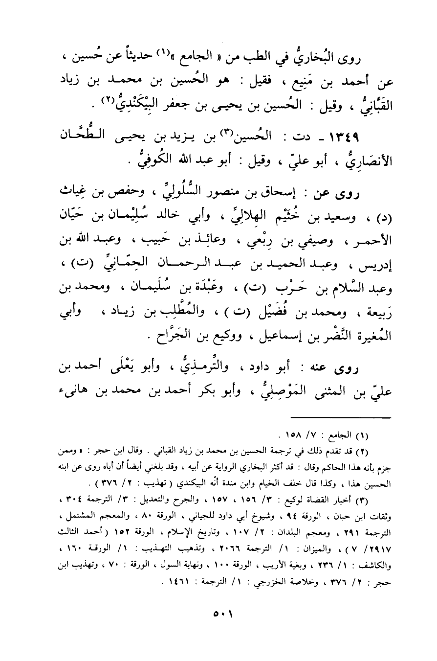 (2) قد تقدم ذلك في ترجمة الحسين بْن مُحَمَّد بْن زياد القباني. وَقَال ابن حجر: وممن جزم بأنه هذا الحاكم وَقَال: قد أكثر البخاري الرواية عَن أبيه: وقد بلغني أيضا أن أباه روى عن ابنه الحسين هذا، وكذا قال خلف الخيام وابن مندة أنه البيكندي (تهذيب: 2 / 376) .