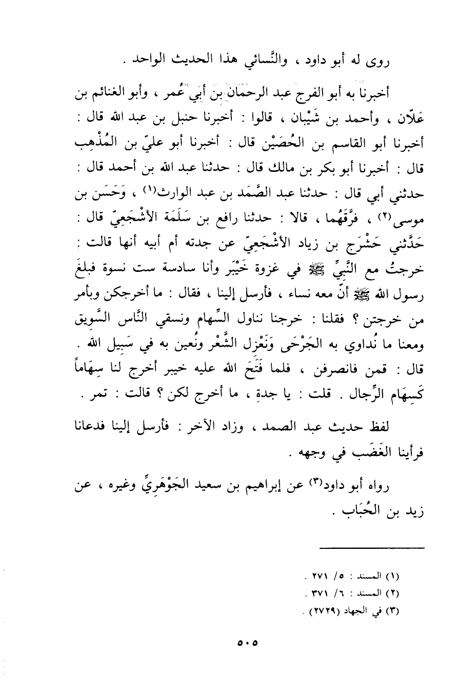 أخبرنا بِهِ أَبُو الْفَرَجِ عَبْدُ الرَّحْمَنِ بْنُ أَبي عُمَر، وأَبُو الْغَنَائِمِ بْنُ عَلانَ، وأَحْمَدُ بْنُ شَيْبَانَ، قَالُوا: أَخْبَرَنَا حنبل بْن عَبد الله قال: أَخْبَرَنَا أبو القاسم بْن الحصين قال: أَخْبَرَنَا أبو علي بْن المذهب قال: أَخْبَرَنَا أبو بكر بْن مالك قال: حَدَّثَنَا عَبد اللَّهِ بْن أَحْمَدَ قال: حَدَّثني أبي قال: حَدَّثَنَا عَبْد الصمد بن عبد الوارث (1) ، وحسن بْنُ مُوسَى (2) ، فَرَّقَهُمَا، قَالا: حَدَّثَنَا رَافِعُ بْنُ سَلَمَةَ الأَشْجَعِيُّ قال: حَدَّثَنِي حَشْرَجُ بْنُ زِيَادٍ الأَشْجَعِيُّ عن جَدَّتِهِ أُمِّ أَبِيهِ أَنَّهَا قَالَتْ: خَرَجْتُ مَعَ النَّبِيِّ صلى اللَّهُ عَلَيْهِ وسَلَّمَ فِي غزوة خَيْبَرَ وأَنَا سَادِسَةُ سِتِّ نِسْوَةٍ فَبَلَغَ رَسُولُ اللَّهِ صلى الله عليه وسلم أَنَّ مَعَهُ نِسَاءٌ، فَأَرْسَلَ إِلَيْنَا، فَقَالَ: مَا أَخْرَجَكُنَّ وبِأَمْرِ مَنْ خَرَجْتُنَّ؟ فَقُلْنَا: خَرَجْنَا نُنَاوِلُ السِّهَامَ ونَسْقِي النَّاسَ السَّوِيقَ ومَعَنَا مَا نُدَاوِي بِهِ الْجَرْحَى ونَعْزِلُ الشَّعْرَ ونُعِينُ بِهِ فِي سَبِيلِ اللَّهِ. قال: قُمْنَ فَانْصَرِفْنَ، فَلَمَّا فَتَحَ اللَّهُ عَلَيْهِ خَيْبَرَ أَخْرَجَ لَنَا سَهْامًا كَسِهَامِ الرِّجَالِ. قُلْتُ: يَا جَدَّةُ، مَا أَخْرَجَ لَكُنَّ؟ قَالَتْ: تمْرٌ.