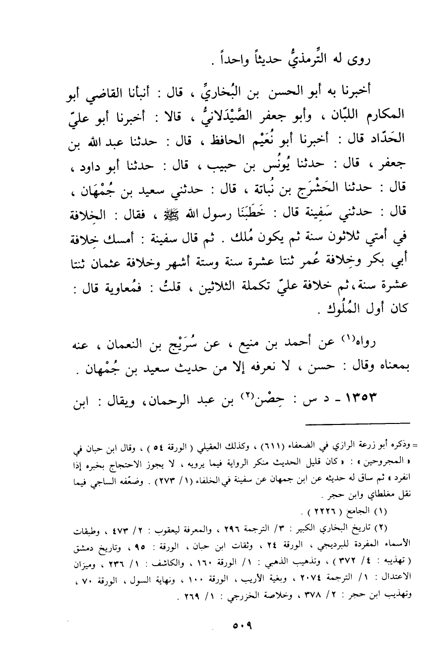 أخبرنا بِهِ أَبُو الْحَسَنِ بْنُ الْبُخَارِيِّ، قال: أَنْبَأَنَا الْقَاضِي أَبُو الْمَكَارِمِ اللَّبَّانُ، وأَبُو جَعْفَرٍ الصَّيْدَلانِيُّ، قالا: أَخْبَرَنَا أَبُو علي الحداد قال: أَخْبَرَنَا أَبُو نُعَيْمٍ الْحَافِظُ، قال: حَدَّثَنَا عَبد اللَّهِ بْن جَعْفَرٍ، قال: حَدَّثَنَا يُونُسُ بْنُ حَبِيبٍ، قال: حَدَّثَنَا أَبُو دَاوُدَ، قال: حَدَّثَنَا الْحَشْرَجُ بْنُ نَبَاتَةَ، قال: حدثني سَعِيد بن جمهان، قال: حَدَّثَنِي سَفِينَةُ قال: خَطَبَنَا رَسُول اللَّهِ صلى الله عليه وسلم، فَقَالَ: الْخِلافَةُ فِي أُمَّتِي ثَلاثُونَ سَنَةٍ ثُمَّ يَكُونُ مُلْكٌ. ثُمَّ قال سَفِينَةُ: أَمْسِكْ خِلافَةَ أَبِي بَكْرٍ وخِلافَةَ عُمَر ثْنَتَا عَشَرَةَ سَنَةً وسِتَّةَ أَشْهُرٍ وخِلافَةَ عُثْمَانَ ثنتا عشر سَنَةً، ثُمَّ خِلافَةَ عَلِيٍّ تَكْمِلَةُ الثَّلاثِينَ، قُلْتُ: فَمُعَاوِيَةُ قال: كَانَ أَوَّلَ الْمُلُوكِ.