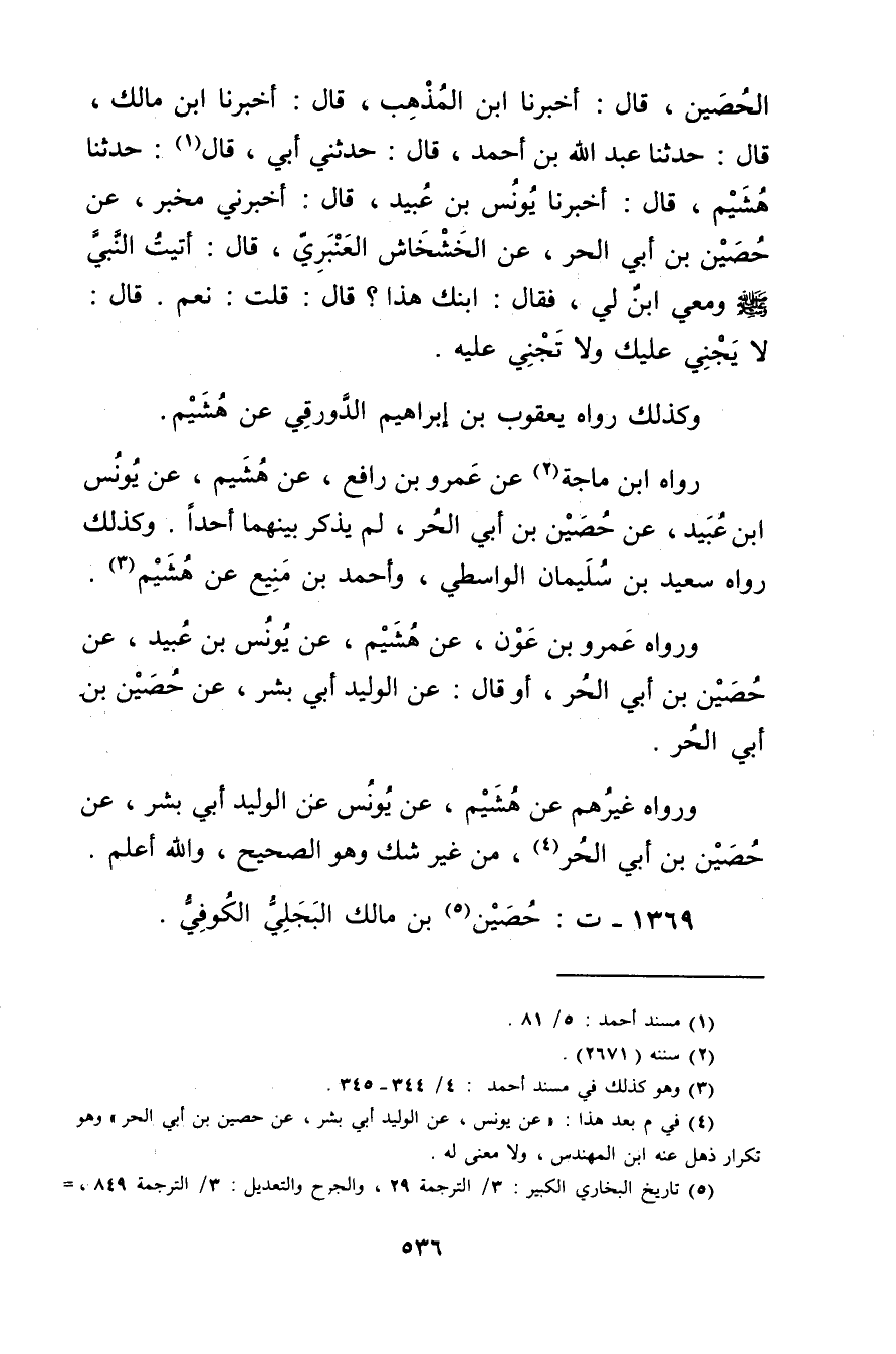 الْحُصَيْنِ، قال: أخبرنا ابْنُ الْمُذْهِب، قال: أخبرنا ابْن مالك، قال: حَدَّثَنَا عَبد اللَّهِ بْنُ أَحْمَدَ، قال حَدَّثني أبي، قال (1) : حَدَّثَنَا هُشَيْمٌ، قال: أخبرنا يُونُسُ بْنُ عُبَيد، قال: أَخْبَرَنِي مُخْبِرٌ، عن حُصَيْنُ بْنُ أَبي الْحُرِّ، عن الْخَشْخَاشِ الْعَنْبَرِيِّ، قال: أَتَيْتُ النَّبِيَّ صلى الله عليه وسلم. معي ابْنٌ لِي، فَقَالَ: ابْنُكَ هَذَا؟ قال: قُلْتُ: نَعَمْ. قال: لا يَجْنِي عَلَيْكَ ولا تَجْنِي عَلَيْهِ.