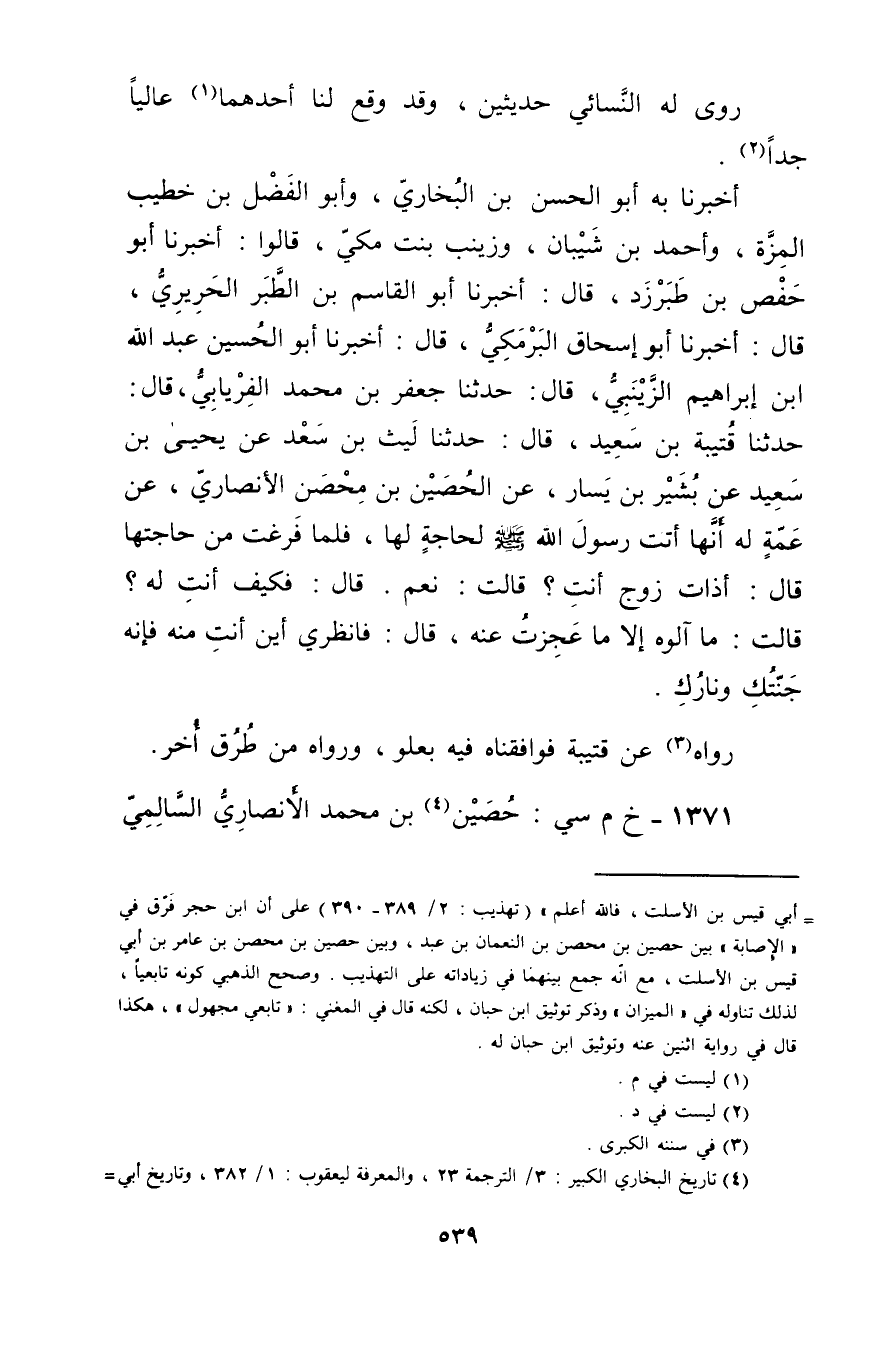 أخبرنا بِهِ أَبُو الْحَسَنِ بْنُ الْبُخَارِيِّ، وأَبُو الْفَضْلِ بْنُ خَطِيبِ الْمِزَّةِ، وأَحْمَدُ بْنُ شَيْبَانَ، وزَيْنَبُ بِنْتُ مَكِّيٍّ، قَالُوا: أَخْبَرَنَا أَبُو حفص بن طَبَرْزَذَ، قال: أَخْبَرَنَا أبو القاسم بْن الطبر الحريري، قال: أخبرنا أَبُو إِسْحَاقَ الْبَرْمَكِيُّ، قال: أخبرنا أَبُو الْحُسَيْنِ عَبد اللَّهِ بْنُ إِبْرَاهِيمَ الزَّيْنَبِيُّ، قال: حَدَّثَنَا جَعْفَرُ بْنُ مُحَمَّدٍ الْفِرْيَابِيُّ، قال: حَدَّثَنَا قُتَيْبَةُ بْنُ سَعِيد، قال: حَدَّثَنَا لَيْثُ بْنُ سَعْدٍ عن يَحْيَى بْنِ سَعِيد عن بَشِيرِ بْنِ يَسَارٍ، عن الْحُصَيْنِ بْنِ مِحْصَنٍ الأَنْصارِيّ، عن عَمَّةٍ لَهُ أَنَّهَا أَتَتْ رسول الله صلى عليه وسلم لِحَاجَةٍ لَهَا، فَلَمَّا فَرَغَتْ مِنْ حَاجَتِهَا قال: أَذَاتُ زَوْجٍ أَنْتِ؟ قَالَتْ: نَعَمْ. قال: فَكَيْفَ أَنْتِ لَهُ؟ قَالَتْ: مَا آلوه مَا عَجَزْتُ عَنْهُ، قال: فَانْظُرِي أَيْنَ أَنْتِ مِنْهُ فَإِنَّهُ جَنَّتُكِ ونَارُكِ.