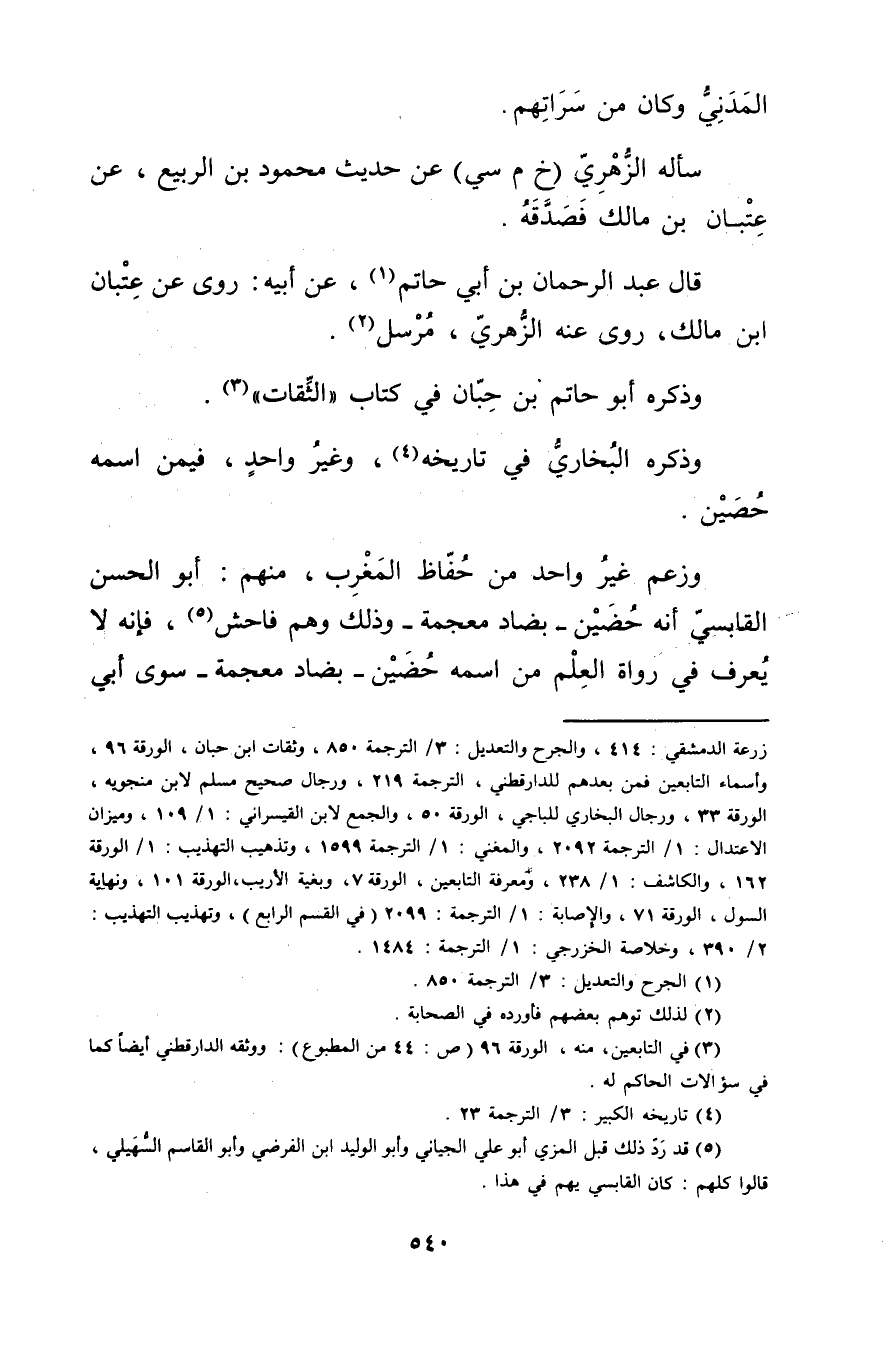 وزعم غير واحد من حفاظ المغرب، منهم: أَبُو الْحَسَن القابسي أنه حضين - بضاد معجمة - وذلك وهم فاحش (5) ، فإنه لا يعرف في رواة العلم من اسمه حضين - بضاد معجمة سوى ابي