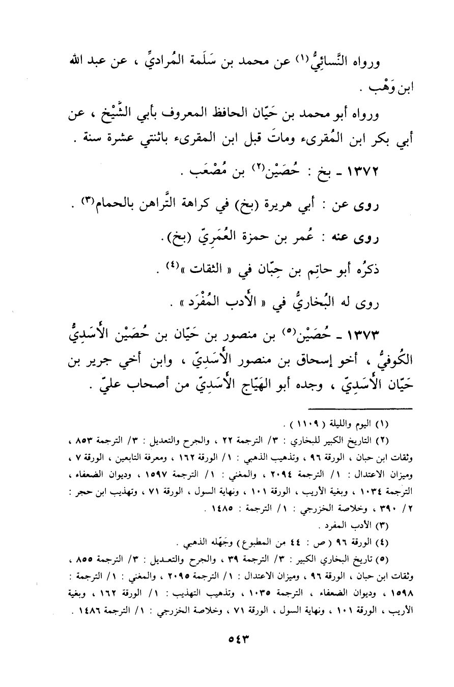 1373 - حصين بن منصور بن حيان بن حصين الأسدي الكوفي (5) ، أخو إسحاق بْن منصور الأسدي، وابن أخي جرير بْن حيان الأسدي، وجده أَبُو الهياج الأسدي من أصحاب علي.