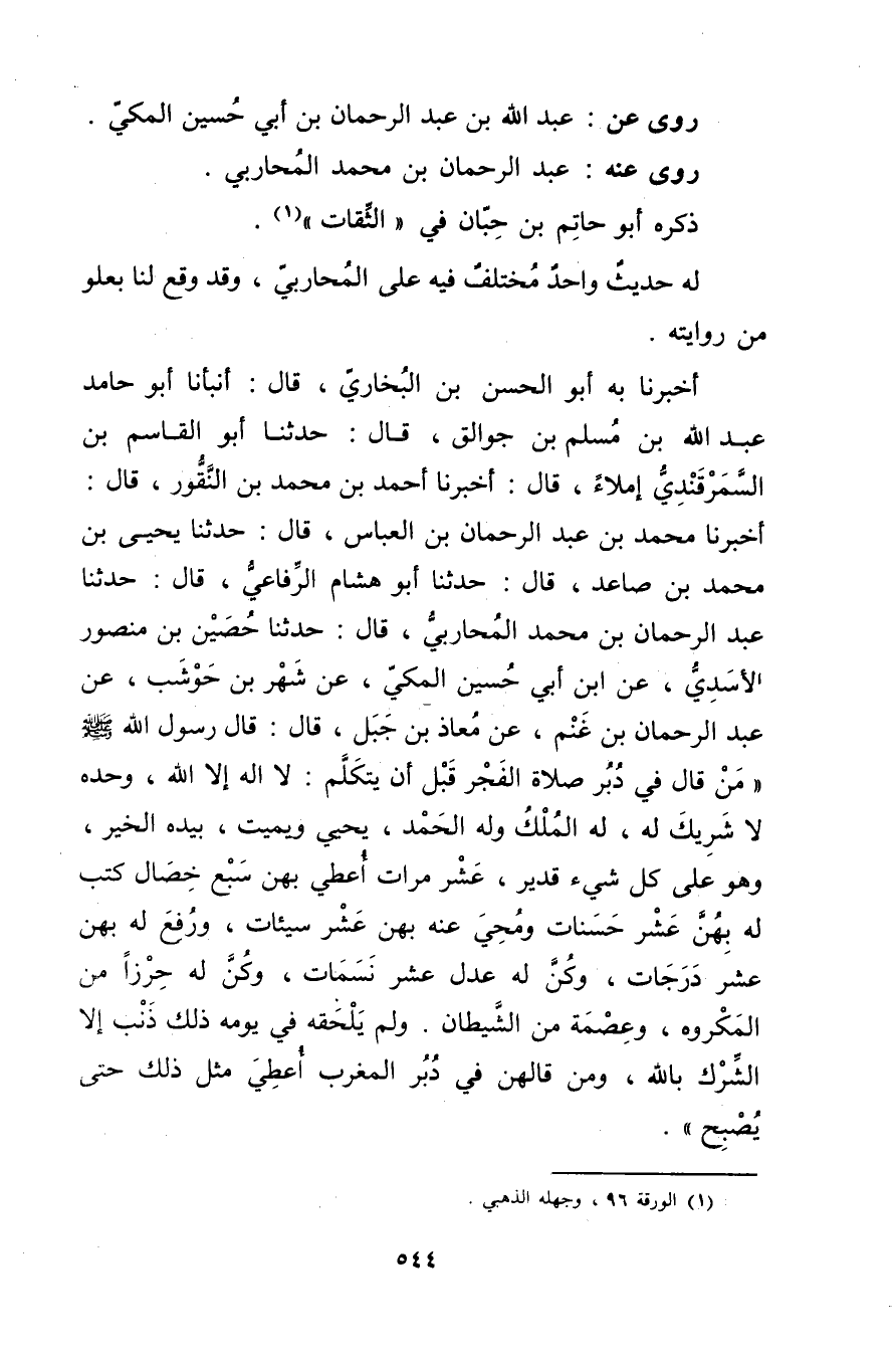 أخبرنا بِهِ أَبُو الْحَسَنِ بْنُ الْبُخَارِيِّ، قال: أَنْبَأَنَا أَبُو حَامِدٍ عَبد اللَّهِ بْنُ مُسْلِمِ بْنِ جُوَالِقَ، قال: حَدَّثَنَا أَبُو الْقَاسِمِ بْنُ السَّمَرْقَنْدِيِّ إِمْلاءً، قال: أخبرنا أَحْمَدُ بْنُ مُحَمَّدِ بْنِ النَّقُّورِ، قال: أخبرنا مُحَمَّد بْنُ عَبْدِ الرَّحْمَنِ بْنِ الْعَبَّاسِ، قال: حَدَّثَنَا يَحْيَى بْن مُحَمَّد بْن صاعد، قال: حَدَّثَنَا أَبُو هِشَامٍ الرِّفَاعِيُّ، قال: حَدَّثَنَا عَبْد الرَّحْمَنِ بْن مُحَمَّد الْمُحَارِبِيُّ، قال: حَدَّثَنَا حُصَيْنُ بْنُ مَنْصُورٍ الأَسَدِيُّ، عن ابْنِ أَبي حُسَيْنٍ الْمَكِّيِّ، عن شَهْرِ بْنِ حَوْشَبٍ، عن عَبْدِ الرَّحْمَنِ بْنِ غَنْمٍ، عن مُعَاذِ بْنِ جَبَلٍ، قال رَسُولُ اللَّهِ صلى الله عليه وسلم"مَنْ قال فِي دُبُرِ صَلاةِ الْفَجْرِ قَبْلَ أَنْ يَتَكَلَّمَ: لا إِلَهَ إِلا اللَّهُ، وحْدَهُ لا شَرِيك لَهُ، لَهُ الْمُلْكُ ولَهُ الْحَمْدُ، يُحْيِي ويُمِيتُ، بِيَدِهِ الْخَيْرُ، وهُوَ عَلَى كُلِّ شَيْءٍ قَدِيرٌ، عَشْرَ مَرَّاتِ أُعْطِيَ بِهِنَّ سَبْعَ خِصَالٍ كُتِبَ لَهُ بِهِنَّ عَشْرُ حَسَنَاتٍ ومُحِيَ عَنْهُ بِهِنَّ عَشْرُ سَيِّئَاتٍ، ورُفِعَ لَهُ بِهِنَّ عَشْرُ دَرَجَاتٍ، وكُنَّ لَهُ عِدْلَ عَشْرِ نَسَمَاتٍ، وكُنَّ لَهُ حِرْزًا مِنَ الْمَكْرُوهِ، وعِصْمَةً مِنَ الشَّيْطَانِ. ولَمْ يَلْحَقْهُ فِي يَوْمِهِ ذَلِكَ ذَنْبٌ إِلا الشِّرْكُ بِاللَّهِ، ومَنْ قَالَهُنَّ فِي دُبُرِ الْمَغْرِبِ أُعْطِيَ مِثْلَ ذَلِكَ حَتَّى يُصْبِحَ.