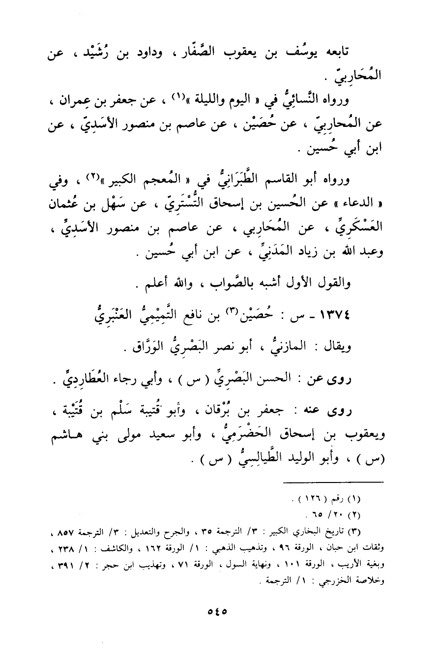 1374 - س: حصين بن نافع التميمي العنبري (3) ويُقال: المازني، أَبُو نصر البَصْرِيّ الوراق.