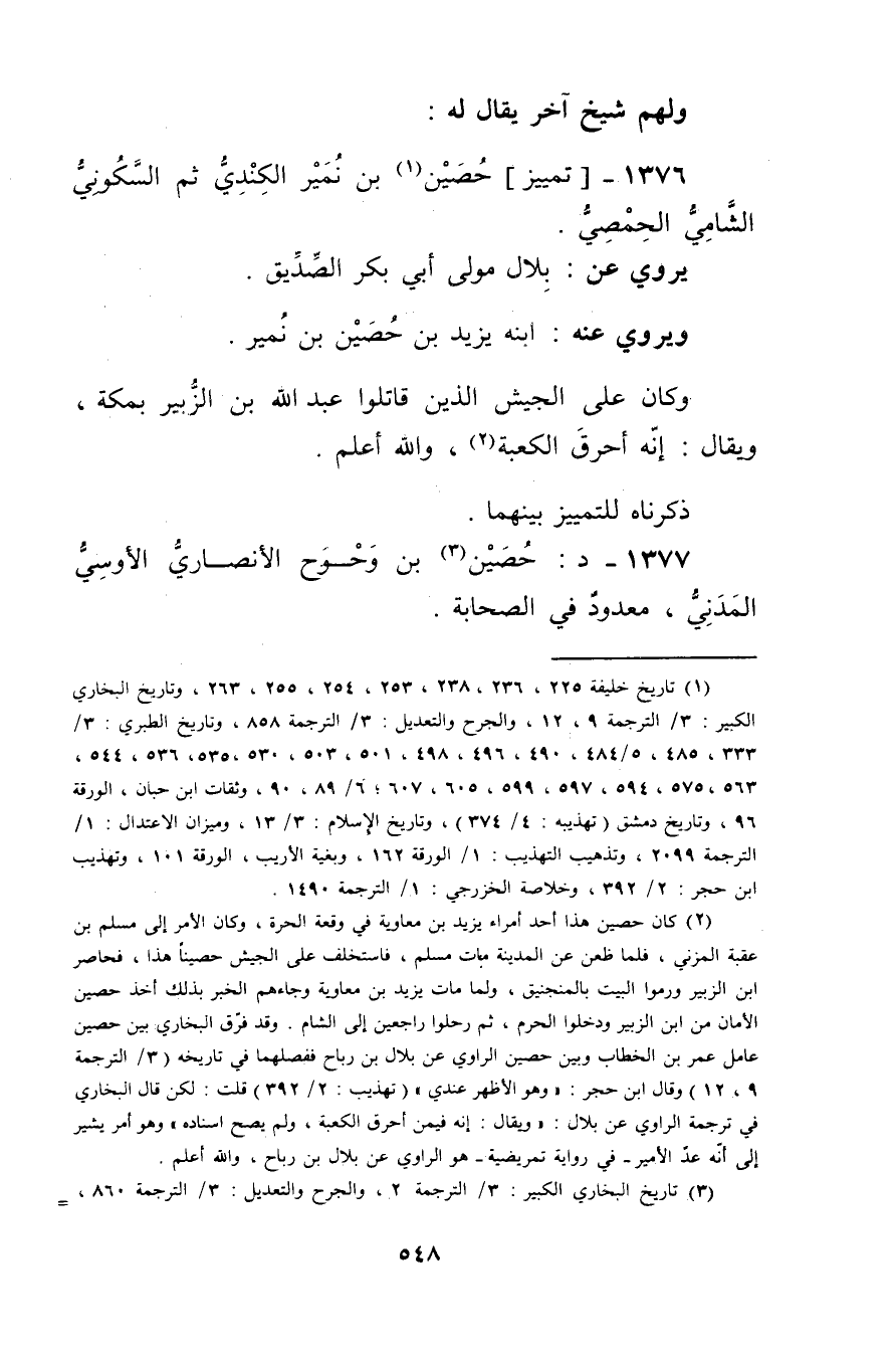 1376 - (تمييز) حصين بن نمير الكندي ثم السكوني الشامي الحمصي (1) .