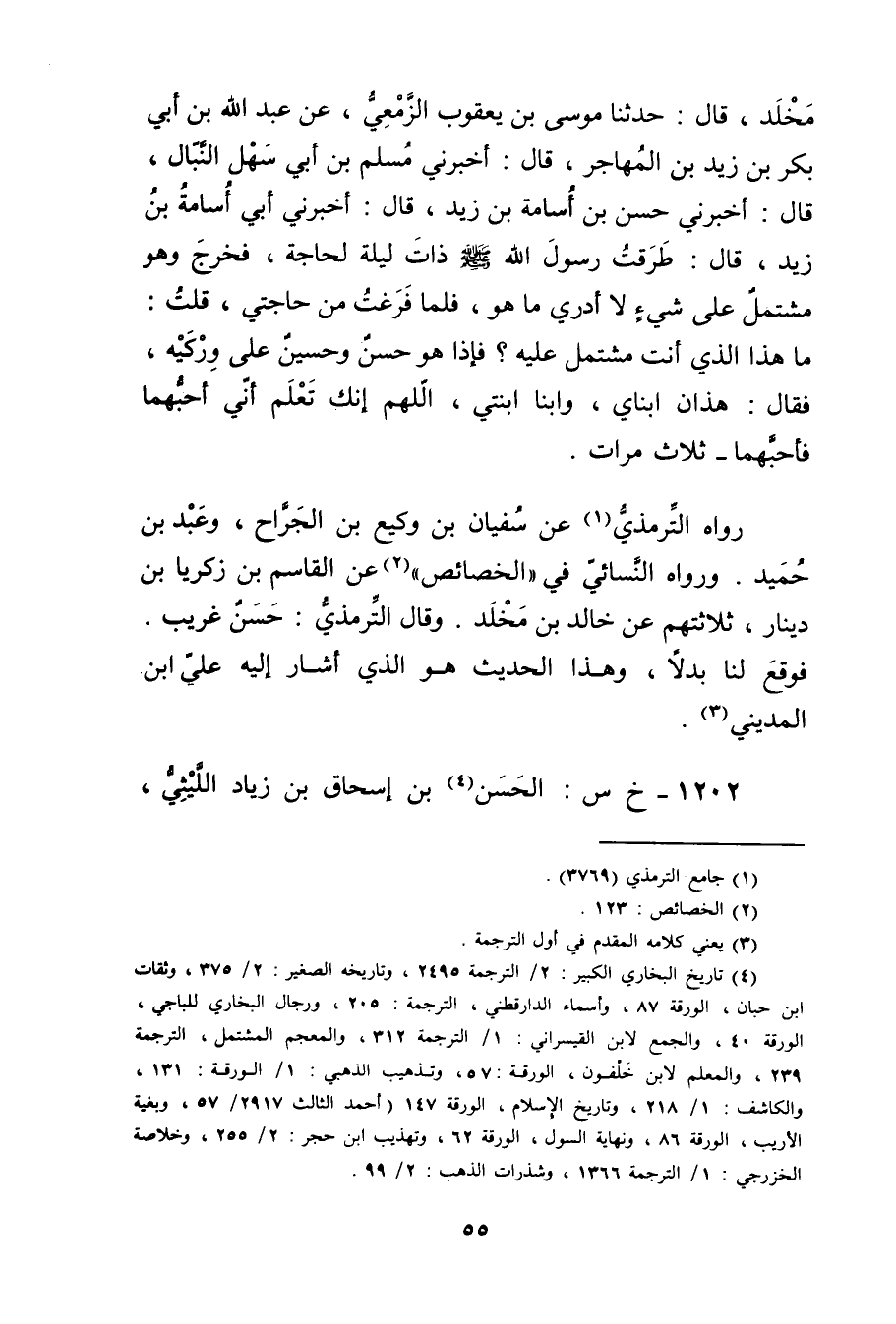 مَخْلَدٍ، قال: حَدَّثَنَا مُوسَى بْنُ يَعْقُوبَ الزَّمْعِيُّ، عن عَبد اللَّهِ بْنِ أَبي بَكْرِ بْنِ زَيْدِ بْنِ الْمُهَاجِرِ، قال: أَخْبَرَنِي مُسْلِمُ بْنُ أَبي سَهْلٍ النَّبَّالُ، قال: أَخْبَرَنِي حَسَنُ بْنُ أُسَامَةَ بْنِ زَيْدٍ، قال: أَخْبَرَنِي أَبِي أُسَامَةُ بْنُ زَيْدٍ، قال: طَرَقْتُ رَسُولَ اللَّهِ صلى الله عليه وسلم ذَاتَ لَيْلَةٍ لِحَاجَةٍ، فَخَرَجَ وهُوَ مُشْتَمِلٌ عَلَى شَيْءٍ لا أَدْرِي مَا هُوَ، فَلَمَّا فَرَغْتُ مِنْ حَاجَتِي، قُلْتُ: مَا هَذَا الَّذِي أَنْتَ مُشْتَمِلٌ عَلَيْهِ؟ فَإِذَا هُوَ حَسَنٌ وحُسَيْنٌ عَلَى ورْكَيْهِ، فَقَالَ: هَذَانِ ابْنَاي، وابْنَا ابْنَتِي، اللَّهُمَّ إِنَّكَ تَعْلَمُ أَنِّي أُحِبُّهُمَا فَأَحِبَّهُمَا - ثَلاثَ مَرَّاتٍ.