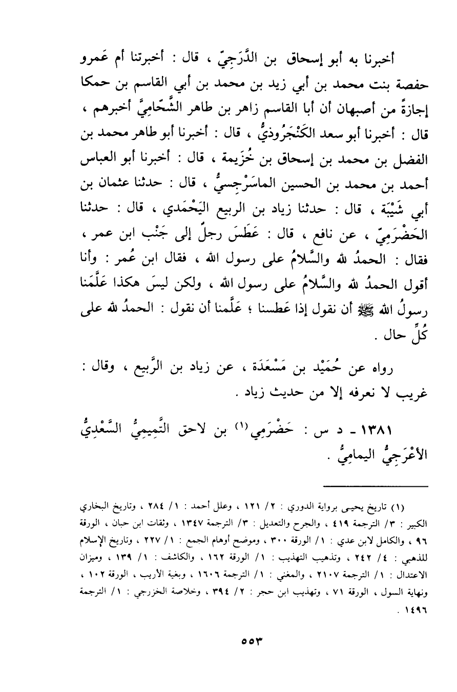 أخبرنا به أَبُو إِسْحَاق بْن الدَّرَجِيِّ، قال أَخْبَرَتْنَا أُمُّ عَمْرو حَفْصَةُ بِنْتُ مُحَمَّدِ بْنِ أَبي زيد مُحَمَّدِ بْن أَبي القاسم بْن حَمَكَا إِجَازَةً مِنْ أَصْبَهَانَ أَنَّ أَبَا الْقَاسِمِ زَاهِرُ بْنُ طَاهِرٍ الشَّحَّامِيُّ أَخْبَرَهُمْ، قال: أخبرنا أَبُو سَعْدٍ الْكَنْجَرُوذِيُّ، قال: أخبرنا أَبُو طَاهِرٍ مُحَمَّدُ بْنُ الْفَضْلِ بْنِ مُحَمَّد بْن إسحاق بْن خزيمة: قال: أَخْبَرَنَا أَبُو الْعَبَّاسِ أَحْمَدُ بْنُ مُحَمَّدِ بْنِ الْحُسَيْنِ الْمَاسَرْجِسِيُّ، قال: حَدَّثَنَا عُثْمَانُ بْنُ أَبي شَيْبَة، قال حَدَّثَنَا زِيَادُ بْنُ الرَّبِيعِ الْيَحْمَدِيُّ، قال: حَدَّثَنَا الْحَضْرَمِيُّ، عن نَافِعٍ، قال: عَطَسَ رَجُلٌ إِلَى جَنْبِ ابْنِ عُمَر، فَقَالَ: الْحَمْدُ لِلَّهِ والسَّلامُ عَلَى رَسُولِ اللَّهِ، فَقَالَ ابْنُ عُمَر: وأَنَا أَقُولُ الْحَمْدُ لِلَّهِ والسَّلامُ عَلَى رَسُولِ اللَّهِ، ولَكِنْ لَيْسَ هَكَذَا عَلَّمَنَا رَسُولُ اللَّهِ صلى الله عليه وسلم أَنْ نَقُولَ إِذَا عَطَسْنَا، عَلَّمَنَا أَنْ نَقُولَ: الْحَمْدُ لِلَّهِ عَلَى كُلِّ حَالٍ.