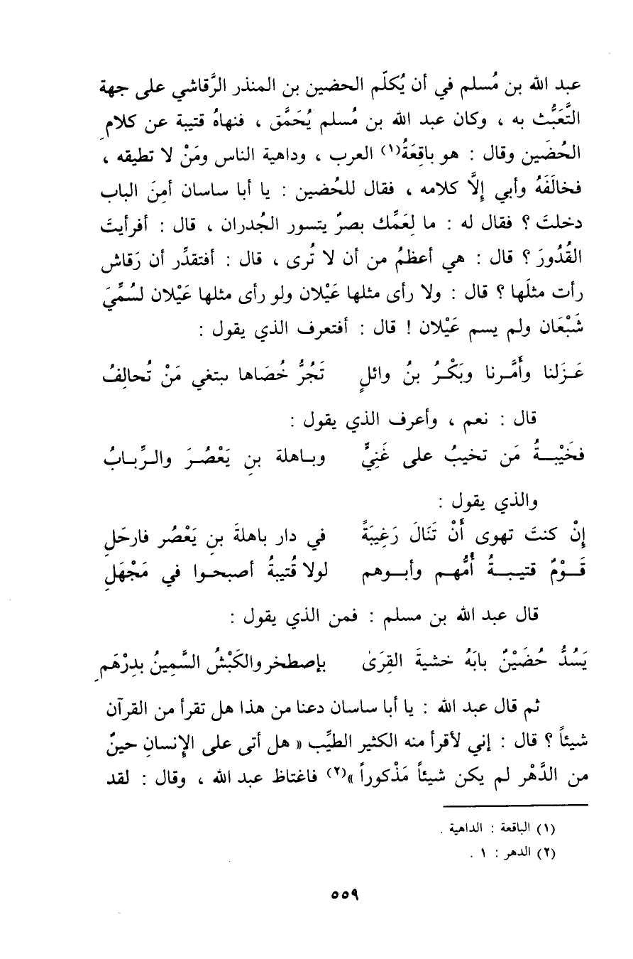 عَبد اللَّه بْن مسلم في أن يكلم الحضين بْن المنذر الرقاشي على جهة التعبث بِهِ، وكان عَبد اللَّه بْن مسلم يحمق، فنهاه قتيبة عن كلام الحضين وَقَال: هو باقعة (1) العرب، وداهية الناس ومن لا تطيقه، فخالفه وأبي إلا كلامه، فقال للحضين: يا أبا ساسان أمن الباب دخلت؟ فقال له: ما لعمك بصر يتسور الجدران، قال: أفرأيت القدور؟ قال: هي أعظم من أن لا ترى، قال: أفتقدر أن رقاش رأت مثلها؟ قال: ولا رأى مثلها عيلان ولو رأى مثلها عيلان لسمي شبعان ولم يسم عيلان! قال: أفتعرف الذي يقول: