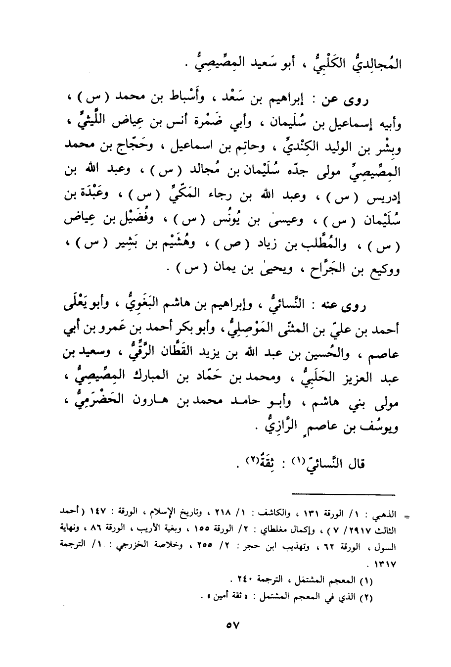 = الذهبي: 1 / الورقة 131، والكاشف: 1 / 218، وتاريخ الاسلام، الورقة: 147 (أحمد الثالث 2917 / 7) ، وإكمال مغلطاي: 2 / الورقة 155، وبغية الاريب، الورقة 86، ونهاية السول، الورقة 62، وتهذيب ابن حجر: 2 / 255، وخلاصة الخزرجي: 1 / الترجمة 1317.