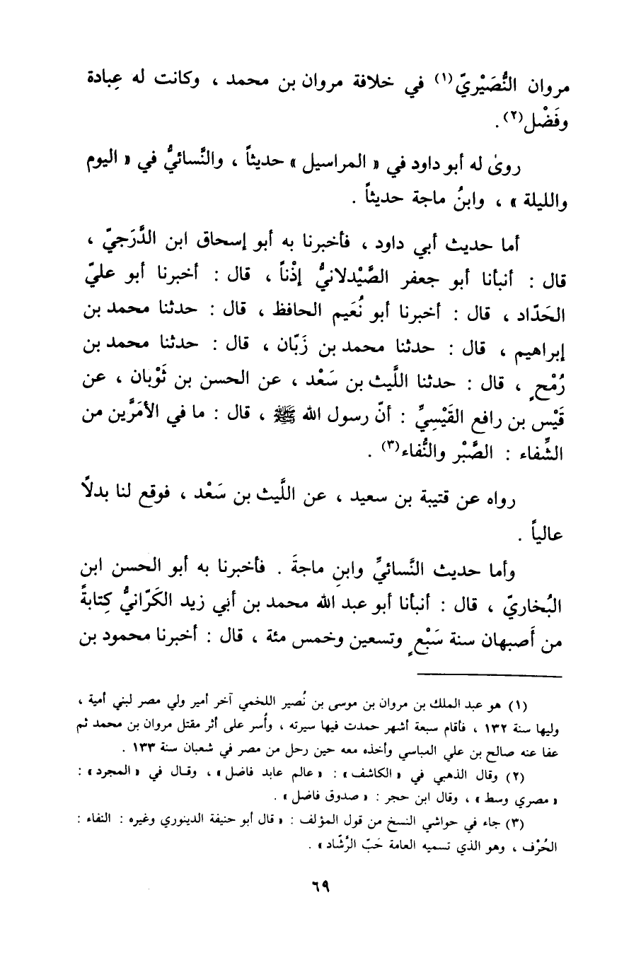 أَمَّا حَدِيثُ أَبِي دَاوُدَ، فَأخبرنا بِهِ أَبُو إِسْحَاقَ ابْنُ الدَّرَجِيِّ، قال: أنبأنا أَبُو جَعْفَرٍ الصَّيْدَلانِيُّ إذنا، قال: أخبرنا أَبُو علي الحداد، قال: أَخْبَرَنَا أبو نعيم الحافظ، قال: حَدَّثَنَا مُحَمَّدُ بْنُ إِبْرَاهِيمَ، قال: حَدَّثَنَا مُحَمَّدُ بْنُ زبان، قال: حَدَّثَنَا محد بْنُ رُمْحٍ، قال: حَدَّثَنَا اللَّيْثُ بْنُ سَعْدٍ، عن الْحَسَنِ بْنِ ثَوْبَانَ، عن قَيْسِ بْنِ رَافِعٍ الْقَيْسِيِّ: أَنَّ رَسُولَ اللَّهِ صلى اللَّهُ عَلَيْهِ وسَلَّمَ، قال: ما فِي الأَمْرَيْنِ مِنَ الشِّفَاءِ: الصَّبْرُ والنفاء (3) .