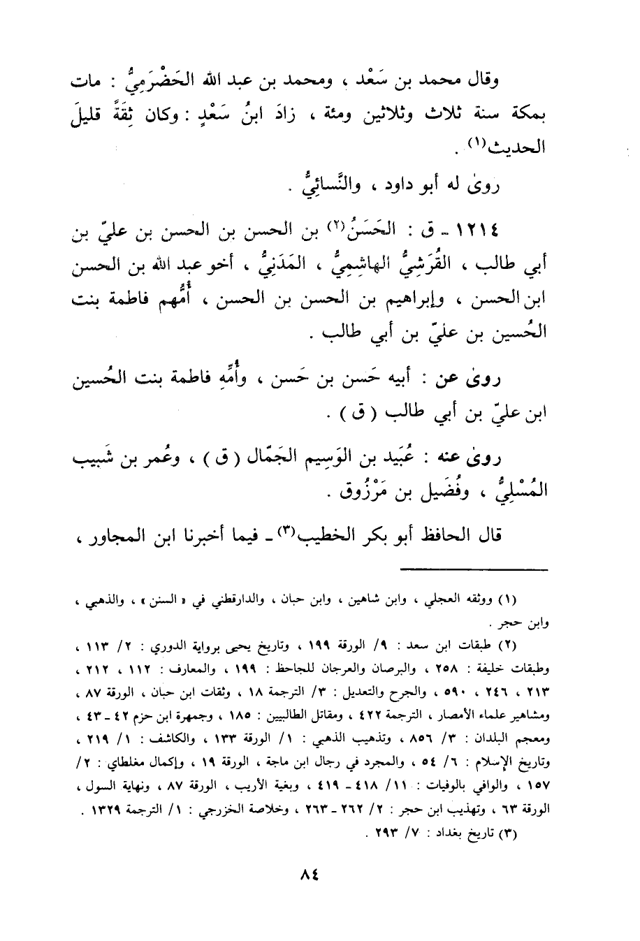 1214 - ق: الْحَسَن بن الحسن بْن الحسن بْن علي بن أَبي طالب (2) ، القرشي الهاشمي، المدني، أخو عَبد الله بْن الْحَسَن بْن الْحَسَن، وإبراهيم بْن الْحَسَن بْن الْحَسَن، أمهم فاطمة بنت الحسين بْن عَلِيّ بْن أَبي طَالِب.