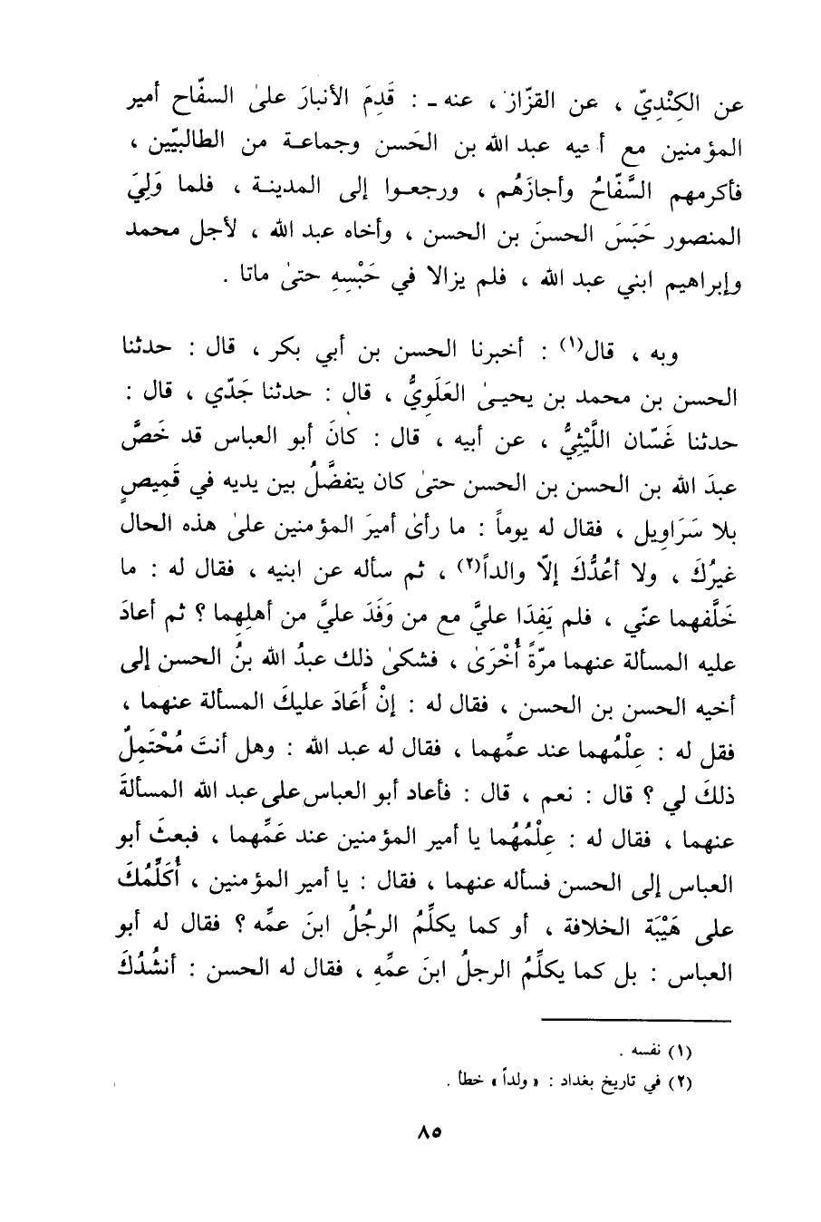 وبه، قال (1) : أخبرنا الْحَسَنُ بْنُ أَبي بَكْرٍ، قال: حَدَّثَنَا الْحَسَن بْن مُحَمَّد بْن يحيى العلوي، قال: حَدَّثَنَا جدي، قال: حَدَّثَنَا غسان الليثي، عَن أبيه، قال: كَانَ أَبُو العباس قد خص عَبد اللَّه بْن الْحَسَن بْن الْحَسَن حتى كَانَ يتفضل بين يديه في قميص بلا سروايل، فقال له يوما: ما رأى أمير المؤمنين على هذه الحال غيرك، ولا أعدك إلا والدا (2) ، ثم سأله عن ابنيه، فقال له: ما خلفهما عني، فلم يفدا عَلِيّ مع من وفد عَلِيّ من أهلهما؟ ثم أعاد عليه المسألة عنهما مرة أخرى، فشكى ذلك عَبد اللَّه بْن الْحَسَن إلى أخيه الْحَسَن بْن الْحَسَن، فقال له: إن أعاد عليك المسألة عنهما، فقل له: علمهما عند عمهما، فقال له عَبد اللَّه: وهل أنت محتمل ذلك لي؟ قال: نعم، قال: فأعاد أَبُو العباس على عَبد اللَّه المسألة عنهما، فقال له: علمهما يا أمير المؤمنين عند عمهما، فبعث أَبُو العباس إلى الْحَسَن فسأله عنهما، فقال: يا أمير المؤمنين، أكلمك على هيبة الخلافة، أو كما يكلم الرجل ابْن عمه؟ فقال له أَبُو العباس: بل كما يكلم الرجل ابْن عمه، فقال له الحسن: أنشدك