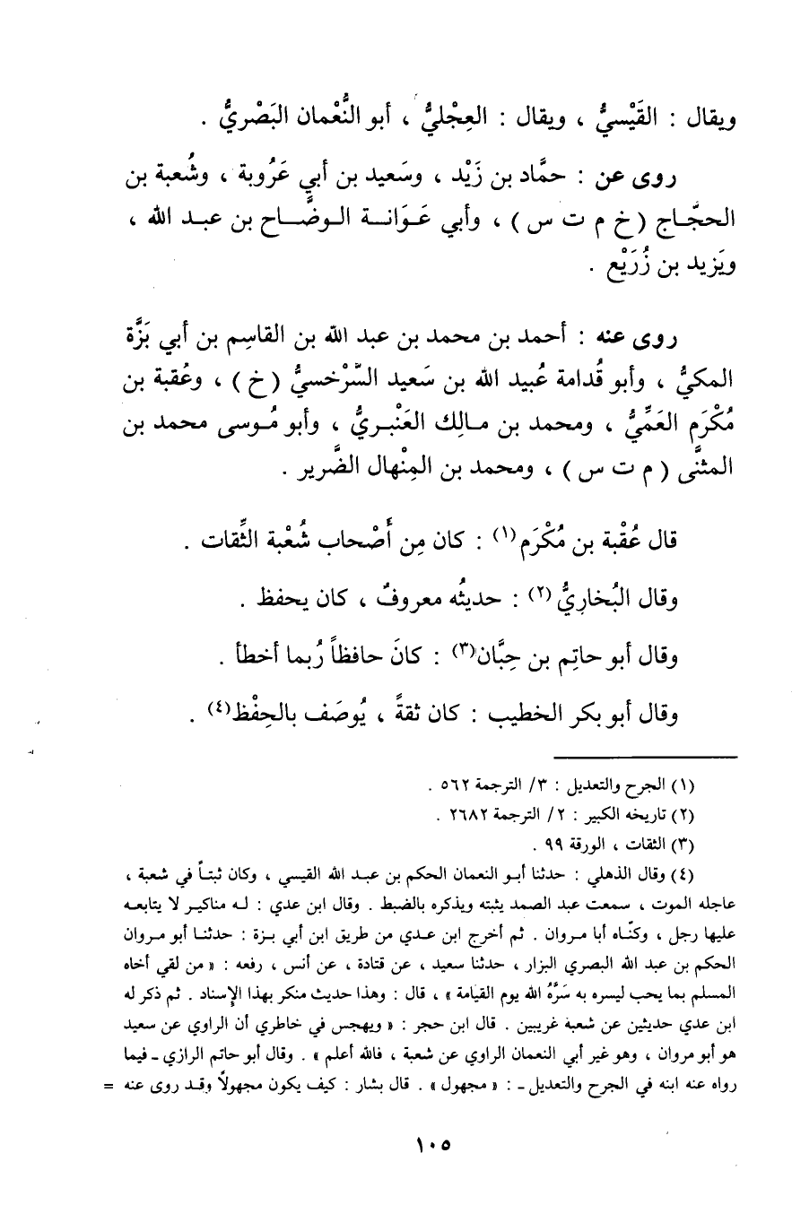 (4) وَقَال الذهلي: حَدَّثَنَا أبو النعمان الحكم بْن عَبد اللَّهِ القيسي، وكان ثبتا في شبعة، عاجله الموت، سمعت عبد الصمد يثبته ويذكره بالضبط. وَقَال ابن عدي: له مناكير لا يتابعه عليها رجل، وكناه أبا مروان.