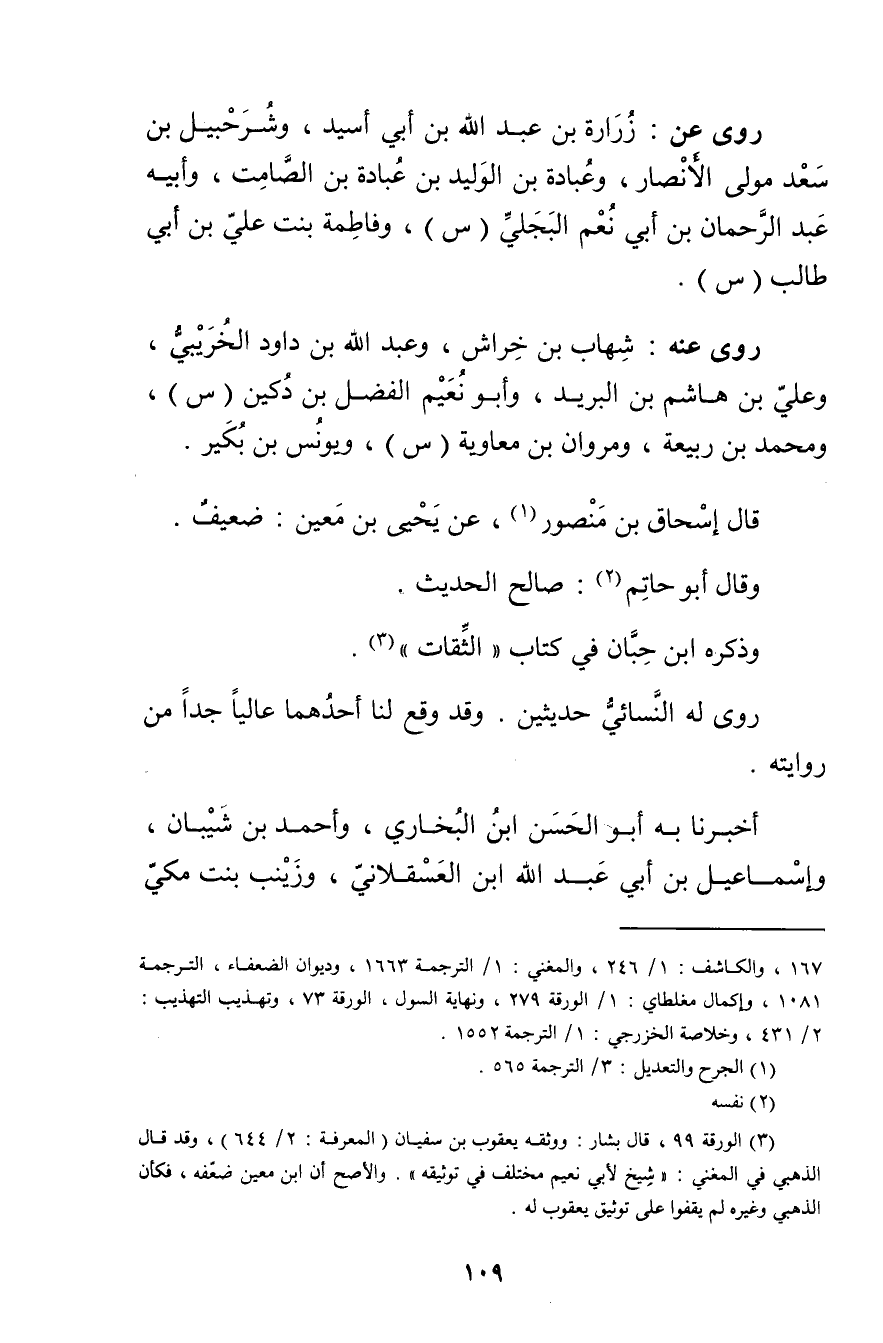 (3) الورقة 99، قال بشار: ووثقه يعقوب بن سفيان (المعرفة: 2 / 644، وقد قال الذهبي في المغني: شيخ لابي نعيم مختلف في توثيقه". والاصح أن ابن مَعِين ضعفه، فكأن الذهبي وغيره لم يقفوا على توثيق يعقوب له.