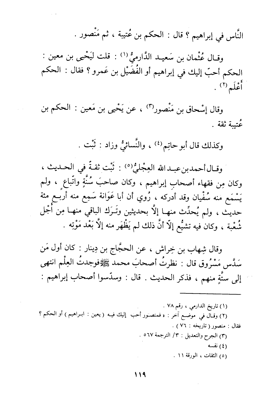 (2) وَقَال في موضع آخر: فمنصور أحب إليك فيه (يعين: ابراهيم) أو الحكم؟ فقال: منصور (تاريخه: 76) .