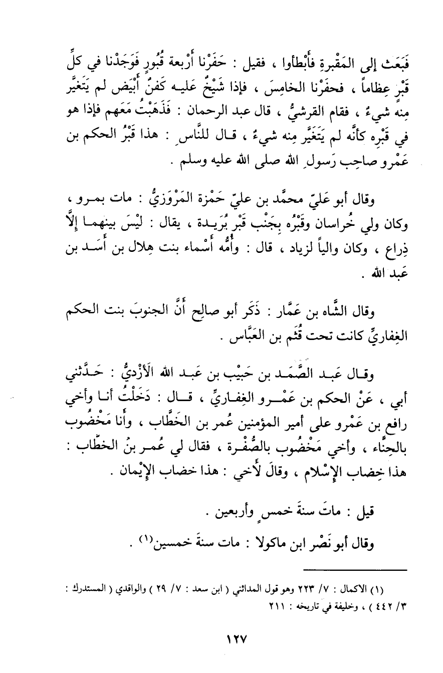 (1) الاكمال: 7 / 223 وهو قول المدائني (ابن سعد: 7 / 29) والواقدي (المستدرك: 3 / 442) ، وخليفة في تاريخه: 211