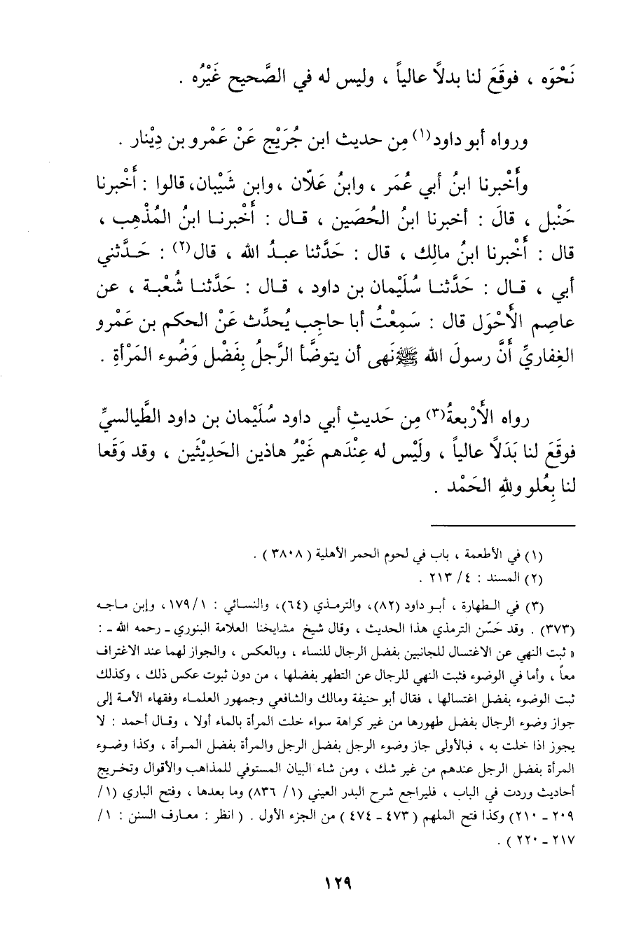 (3) في الطهارة، أبو داود (82) ، والتِّرْمِذِيّ (64) ، والنَّسَائي: 1 / 179، وابن ماجه (373) . وقد حسن التِّرْمِذِيّ هذا الحديث، وَقَال شيخ مشايخنا العلامة البنوري - رحمه الله: ثبت النهي عن الاغتسال للجانبين بفضل الرجال للنساء وبالعكس، والجواز لهما عند الاغتراف معا، وأما في الوضوء فثبت النهي للرجال عن التطهير بفضلها، من دون ثبوت عكس ذلك، وكذلك ثبت الوضوء بفضل اغتسالها، فقال أبو حنيفة ومالك والشافعي وجمهور العلماء وفقهاء الامة إلى جواز وضوء الرجال بفضل طهورها من غير كراهة سواء خلت المرأة بالماء أولا، وَقَال أحمد: لا يجوز إذا خلت به، فبالاولى جاز وضوء الرجل بفضل الرجل والمرأة بفضل المرأة، وكذا وضوء المرأة بفضل الرجل عندهم من غير شك، ومن شاء البيان المستوفي للمذاهب والاقوال وتخريج أحاديث وردت في الباب، فليراجع شرح البدر العيني (1 / 836) وما بعدها، وفتح الباري (1 / 209 - 210) وكذا فتح الملهم (473 - 474) من الجزء الاول. (انظر: معارف السنن: 1 / 217 - 220) .