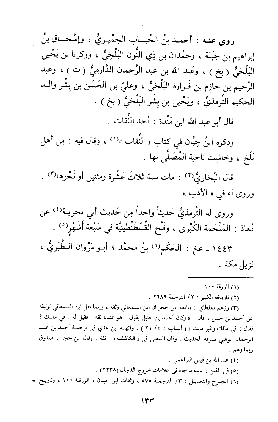 (6) الجرح والتعديل: 3 / الترجمة 575، وثقات ابن حبان، الورقة 100، وتاريخ =